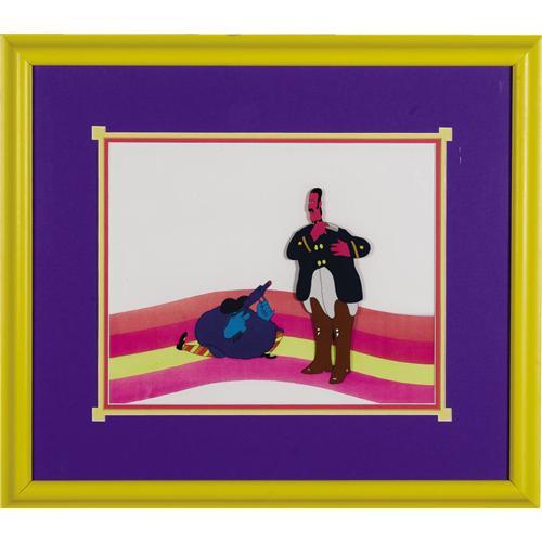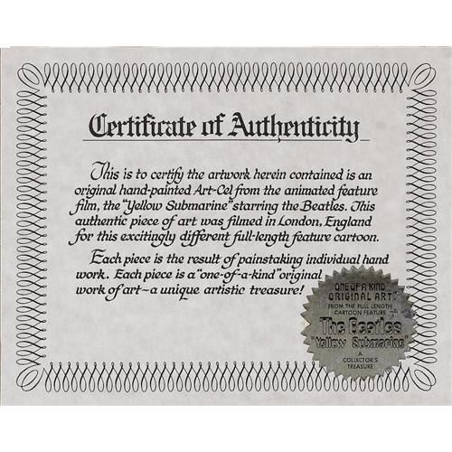 <B>Beatles "Yellow Submarine" Animation Cel.</B></I> An gorgeous hand-painted animation cel from the 1968 animated Beatles feature film, matted and framed (in yellow, of course) to an overall size of 21" x 18.5". In Excellent condition. <I>Accompanied by a certificate of authenticity.</B></I><BR><BR><b>Shipping:</b> Framed - with Glass, Small (<a target="_blank" href="http://www.heritageauctions.com/common/shipping.php">view shipping information</a>)