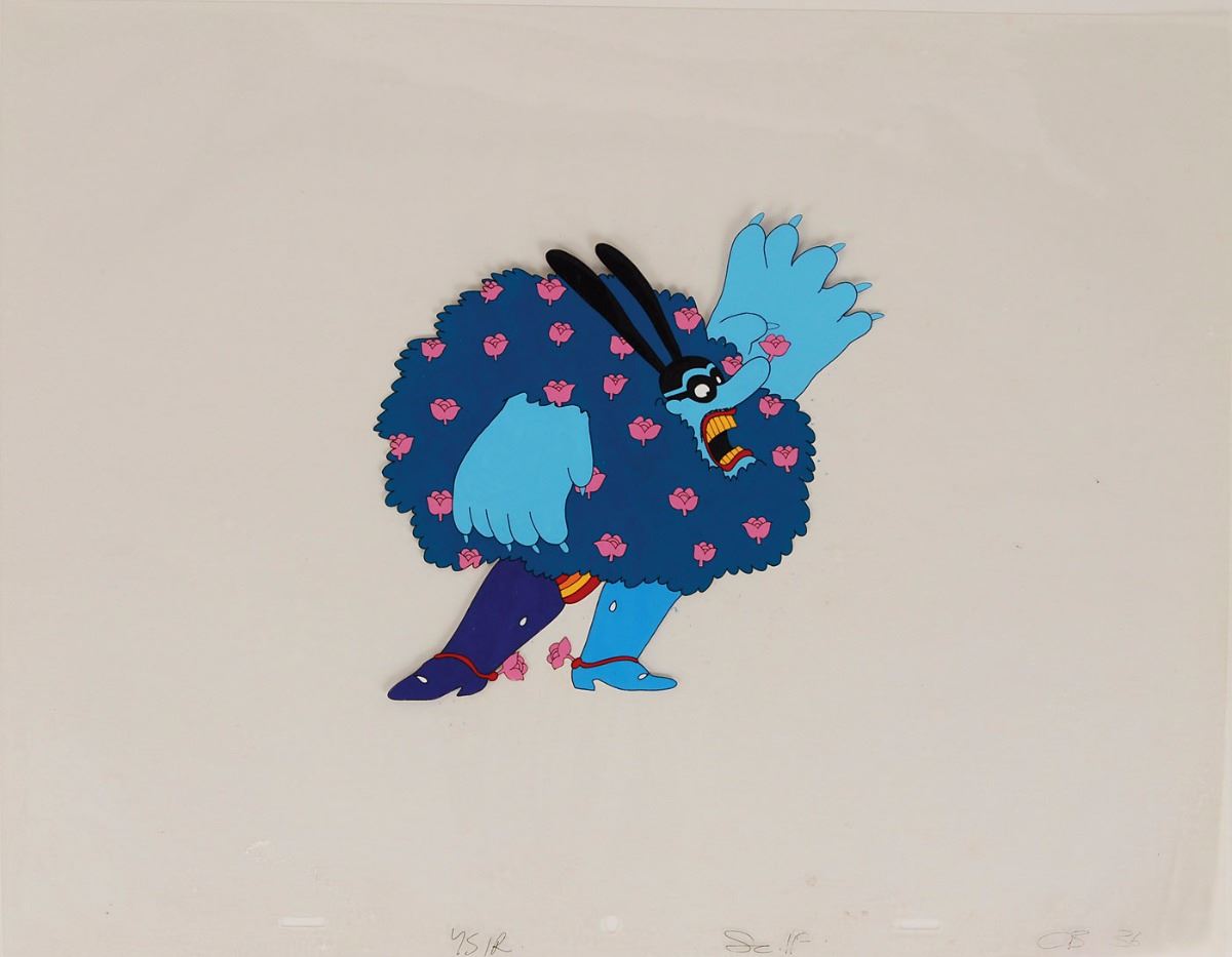 Vibrant original hand-painted production cel featuring the Blue Meanie from Yellow Submarine, showing the brightly colored angry character. Image measures 6.5 x 6 with an overall size of 16 x 12.5. In fine condition.