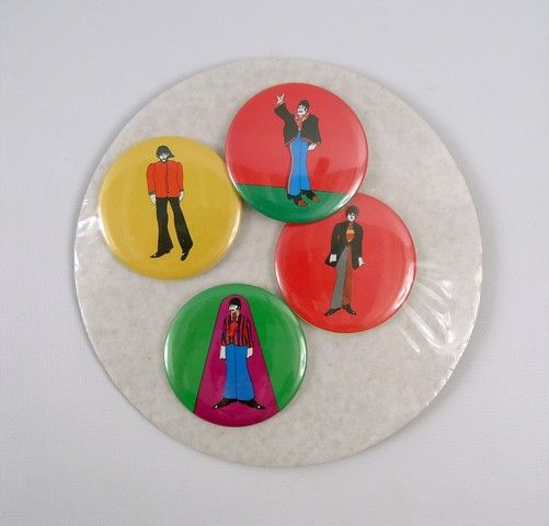 This is a Primrose Confections, Ltd. authentic 1968 vintage original set of four pin-backed buttons that promoted the animated movie "The Beatles Yellow Submarine" (1968). The buttons depict the movie's animated renditions of each of the members of the most famous British Pop Group, The Beatles, who star in the film; Paul McCartney, John Lennon , George Harrison & Ringo Starr. These are the actual buttons, not reproductions. "MFG: ©1968 KING FEATURES SUBAFILMS LTD Primrose Confectionary Ltd. Siough England" is printed along the rim of each button. They are still in the original shrink-wrapped with white cardboard cake coaster backing, never opened, never used. Mint condition, keeping them safe from everything including oxidation to the silver pinback backside. Each button is the original extra large 3.5". Minty mint. A great collectable!