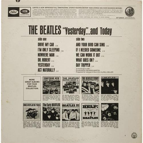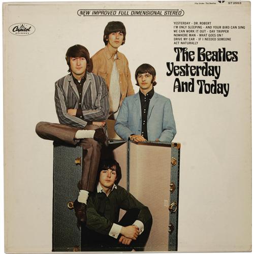 <B>Beatles "Yesterday And Today" Second State Butcher Cover (Capitol ST 2553, 1966).</B></I> The infamous "Butcher Cover" was pulled from distribution so quickly, the chances of finding one are slim, unless, of course you are willing to pay the now high going rate. However, there's always hope that one of the "common" copies of "Yesterday and Today" will turn out to be one of those that started out as a "Butcher Cover", but had the "Trunk Cover" pasted over it. Here's such an example, and it's in nice condition. Condition: EX 7/ EX 7.<BR><BR><b>Shipping:</b> Recordings (<a target="_blank" href="http://www.heritageauctions.com/common/shipping.php">view shipping information</a>)