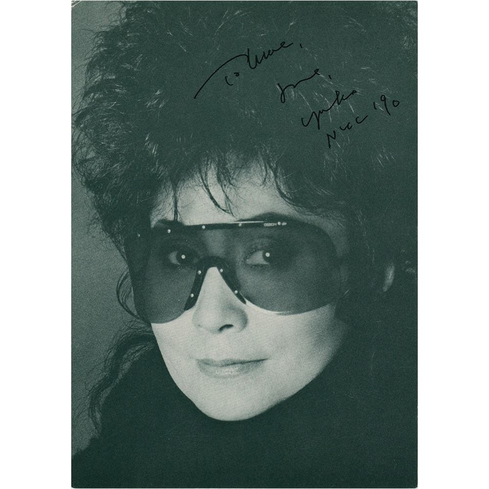 Cardstock 4.25 x 6 close-up photo of Yoko Ono in a pair of sunglasses, signed and inscribed in black felt tip, "To Mae, love, Yoko, NYC '90." In fine condition.
