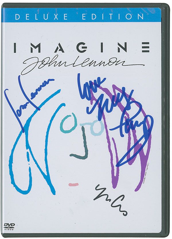 Imagine: John Lennon DVD, signed on the front cover in black felt tip by Yoko Ono and in blue felt tip by Sean Lennon and May Pang. In fine condition. The DVD is included.