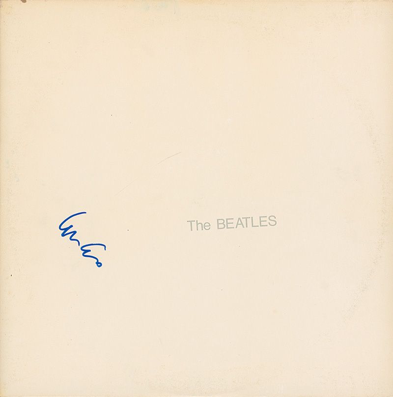 Beatles White album signed on the front cover in blue felt tip. In fine condition, with a mild ‘ring of wear’ to both covers. The record is included.