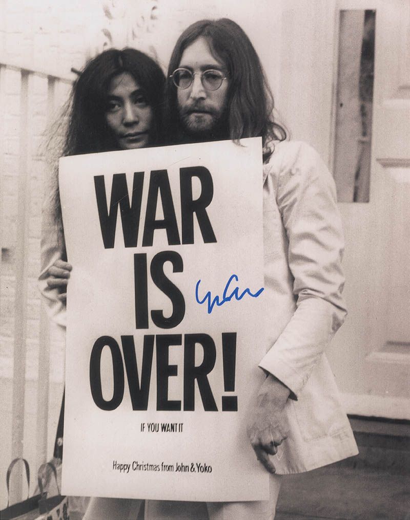 Satin-finish 11 x 14 photo of Yoko holding a ‘War Is Over!’ sign with John Lennon, signed in-person in blue felt tip. In fine condition. Originally obtained by in-person specialist Mike Wehrmann.