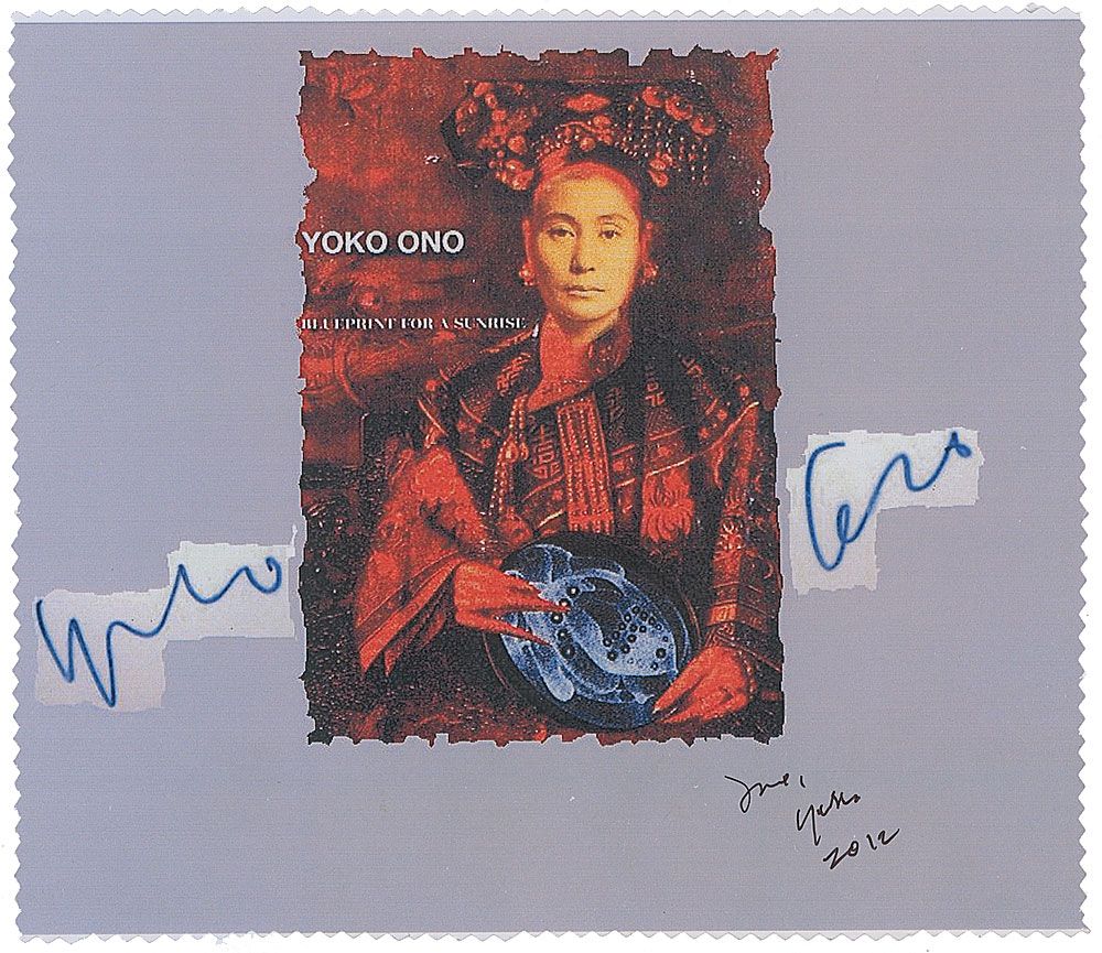 Color archival print, 9 x 8, for Ono’s Blueprint for a Sunrise album, signed in black felt tip, “Love, Yoko, 2012.” Reverse bears a copy of Ono’s December 10, 1980, statement issued to the press after the death of John Lennon. In very fine condition. Accompanied by a ticket to a 2012 gallery exhibit where the signature was obtained.