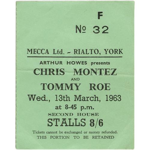 <B>Beatles York Concert Stub.</B></I> A used ticket to their March 13, 1963, performance at the Rialto Theatre in York, in support of Chris Montez and Tommy Roe. In Excellent condition with just a little wear and faint discoloration to the edges. <BR><BR><B>Important noti