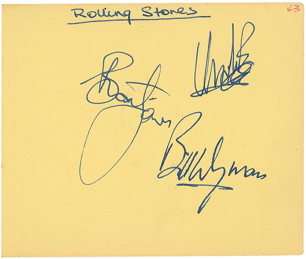 Tremendous vintage autograph album, 4.75 x 4, signed inside in ink by over 60 British bands and musicians from the 1960s, most signed back-to-back. Signers include: John Lennon; Paul McCartney; Brian Jones, Bill Wyman, and Charlie Watts; Roy Orbison; The Cravats; Billy J. Kramer and the Dakotas; Gerry and the Pacemakers; Cliff Richard and the Shadows; Brian Poole and the Tremeloes; The Clique; Johnny Kidd; Four Pennies; Merseybeats; The Swinging Blue Jeans; The Hollies; Gene Pitney; The Crickets; and Dusty Springfield. Lennon and McCartney are on separate, single-signed pages, and Springfield signed on the reverse of the Rolling Stones page. Individual pages in fine condition, with most detached from album’s spine. Accompanied by a letter of provenance from the original owner, stating that he spent 18 months as a professional bass player and acquired many of the signatures at EMI recording studio and ATV House in Aldwych. A fantastic grouping of many of the most influential bands of the 1960s.