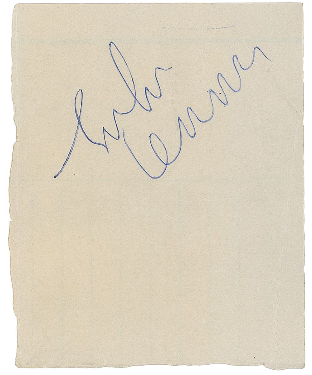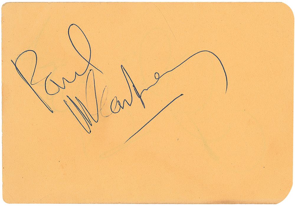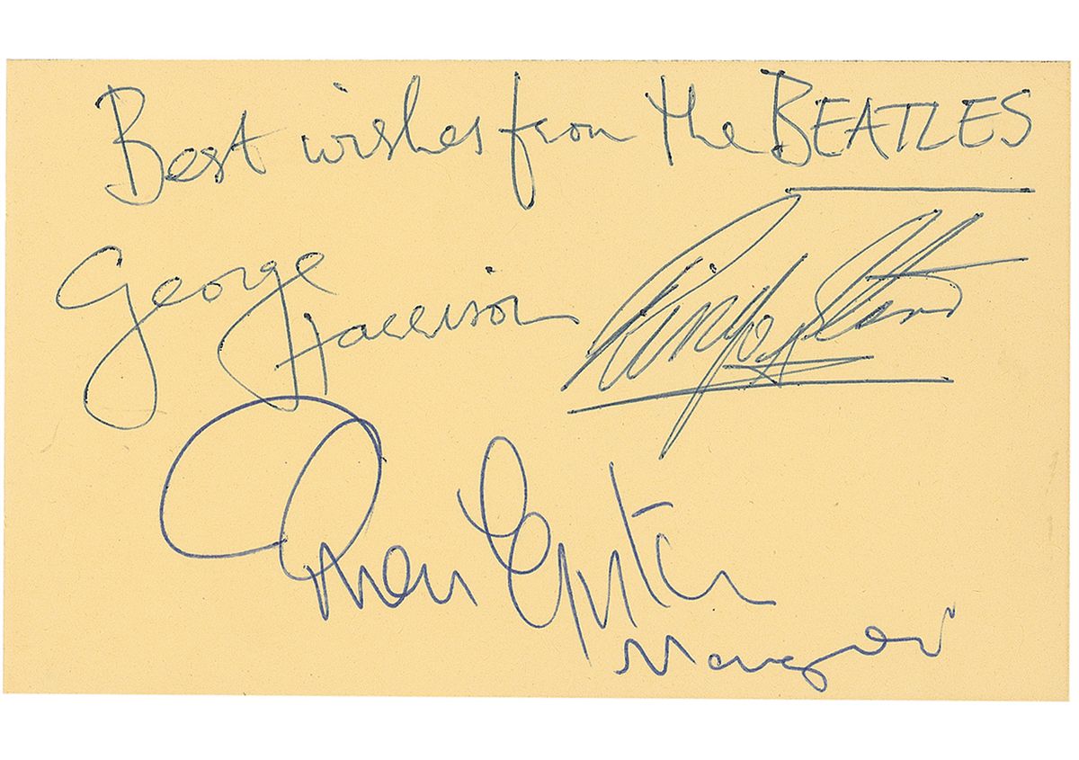 Vintage ballpoint signature, “John Lennon,” on a light gray 3.25 x 4 slip, obtained on December 14, 1963, at The Beatles Fan Club concert which took place at Wimbledon Palais, London; vintage ballpoint signature “Paul McCartney,” on a beige 4.75 x 3.25 album page, circa 1963-64; and vintage ballpoint signatures, “Best wishes from the Beatles, George Harrison,” “Ringo Starr,” and “Brian Epstein, manager,” on a yellow 5.25 x 3 album page. In fine condition, with some light wrinkling to Lennon’s slip; a crease to top left corner of McCartney’s page, as well as a light impression from an unsuccessful first attempt at signing. Epstein seldom signed with the band, and the inclusion of his role with the band is even more unusual. All three could be matted together for an exceptionally nice display.