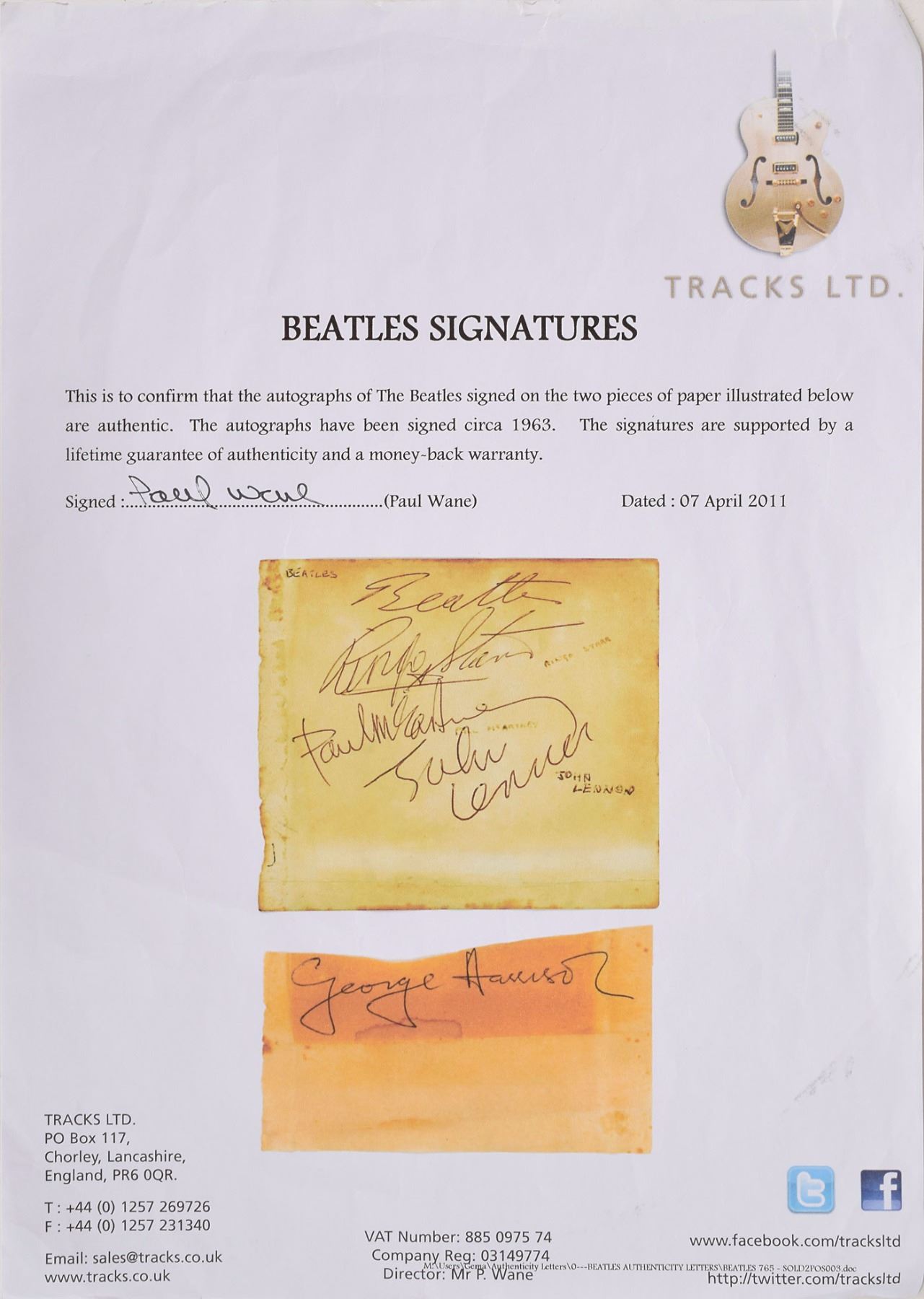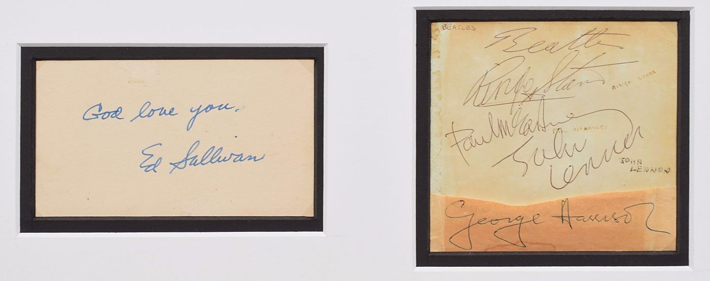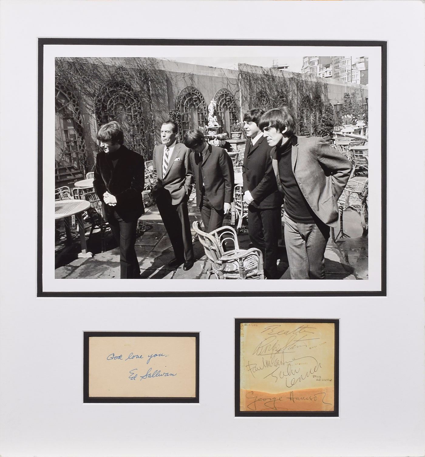 Vintage circa 1963 ballpoint signatures, "Beatles, Ringo Starr," "Paul McCartney," and "John Lennon" on an off-white 4 x 3.75 sheet matted with an adjoining ballpoint signature, "George Harrison," on a beige 4 x 1 slip. Also included is an ink signature, "God love you, Ed Sullivan," on an off-white 4.75 x 2.75 card. All signatures are double-matted with a large glossy photo of the Fab Four standing with Sullivan to an overall size of 19 x 20.25. In very good to fine condition, with toning to the Beatles signatures, a stain to the bottom of the Harrison slip, and two areas of surface loss to the Sullivan card. Accompanied by a certificate of authenticity from Tracks for the Beatles signatures. An estimated 73 million viewers watched the Beatles perform on The Ed Sullivan Show on February 9, 1964, an historic television event that heralded both the forthcoming British invasion and the emergence of Beatlemania across North America. The addition of Sullivan makes for a truly uncommon and highly sought-after Beatles display.