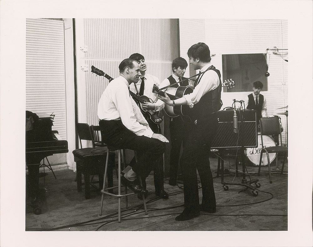 Modern satin-finish 12 x 9.5 print of the Beatles and George Martin from an original negative by photographer Dezo Hoffman, taken while the Beatles were recording their debut album Please Please Me at London’s Abbey Road Studios on February 11, 1963. In fine condition.