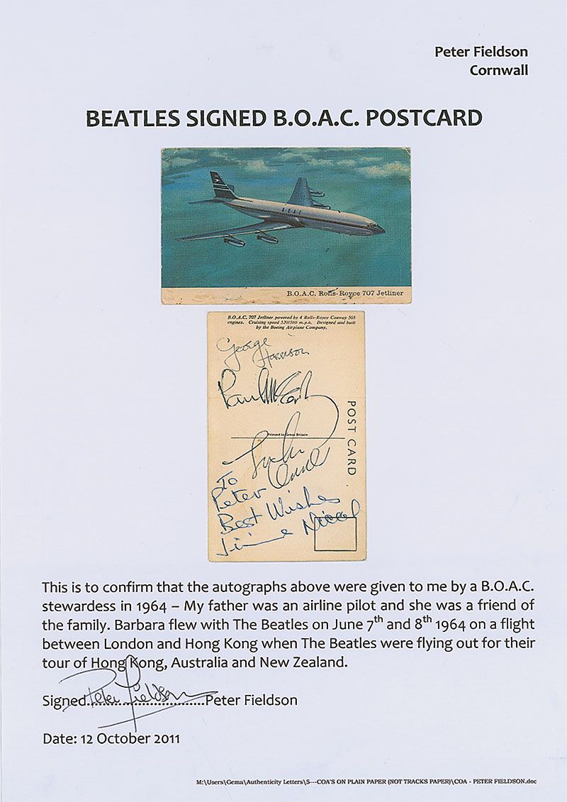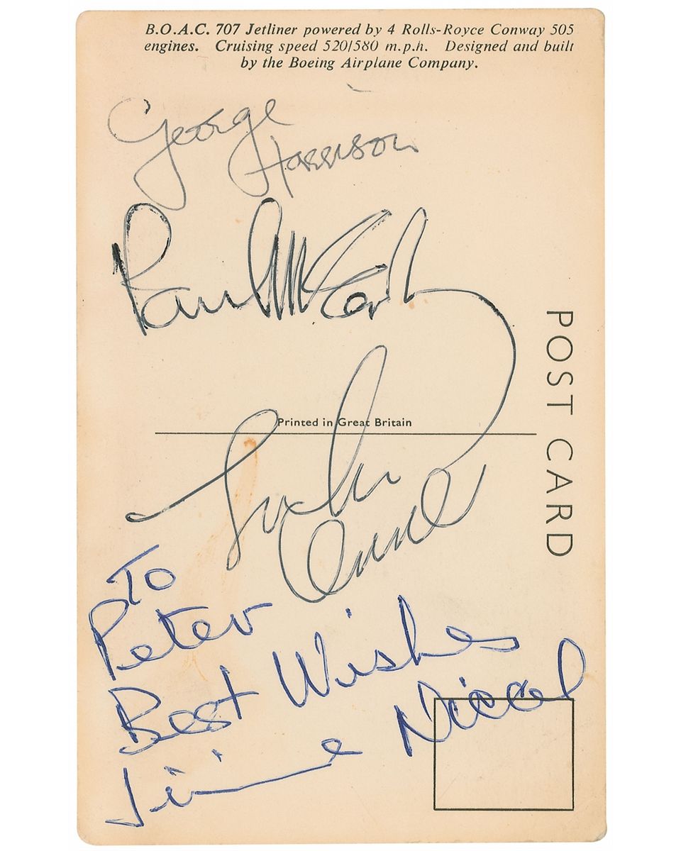 Color vintage 5.25 x 3.25 postcard photo of a B. O. A. C. Rolls Royce 707 jetliner, nicely signed on the reverse in black ballpoint, “George Harrison,” “Paul McCartney,” and “John Lennon,” and signed and inscribed in blue ballpoint, “To Peter, Best wishes, Jimmie Nicol.” Signatures were obtained either on June 7 or 8, 1964, during a flight between London and Hong Kong when The Beatles were flying out for their tour of Hong Kong, Australia, and New Zealand. Accompanied by a letter of provenance stating the signatures were obtained by a stewardess on the flight and a certificate of authenticity from Tracks. In very good condition, with slight area of soiling over beginning of Lennon’s signature, mild toning, surface impressions and soiling to image side, and a few creases. Nicol replaced Ringo Starr from June 3–15, 1964, at the start of the Beatles’ World Tour, while Ringo was suffering from tonsillitis and pharyngitis. An extremely rare offering, as Nicol was with the Beatles for slightly more than a week.