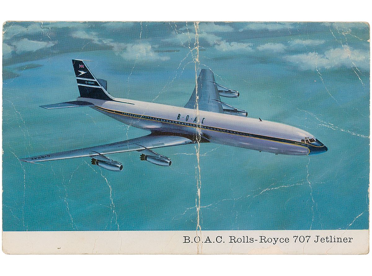 Postcard depicting a British Overseas Airways Corporation Rolls-Royce 707 Jetliner, 5.5 x 3.5, signed on the reverse in blue ballpoint by John Lennon, Paul McCartney, George Harrison, and Jimmie Nicol. In very good condition, with a significant creased central fold passing through a portion of Lennon’s signature, and moderate creases throughout (much more noticeable on the front image than on the reverse). Nicol replaced Ringo Starr from June 3–15, 1964, at the start of the Beatles’ World Tour, while Ringo was suffering from tonsillitis and pharyngitis. An extremely rare piece, as Nicol was with the Beatles for under two weeks, playing a total of eight shows.