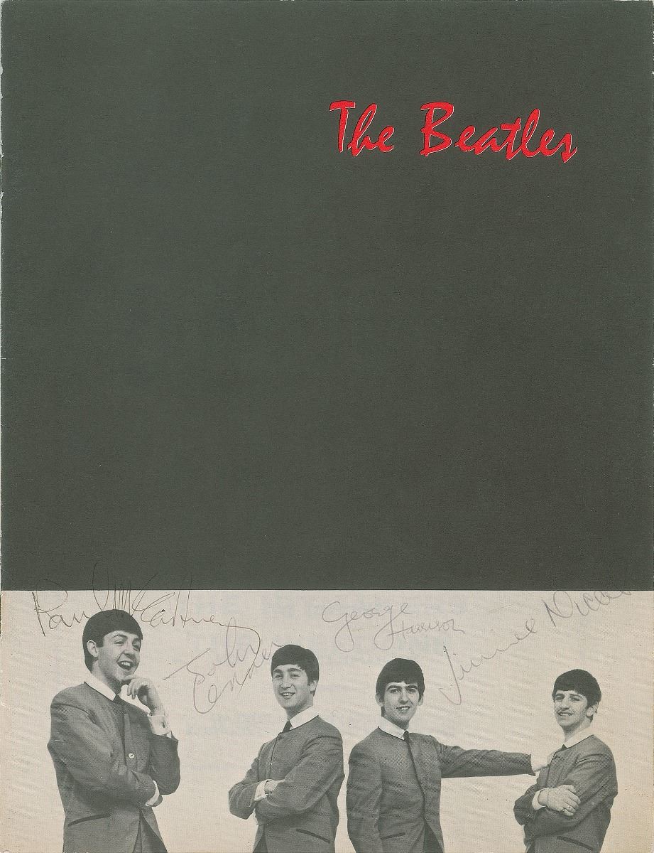 Remarkable Danish program for a Beatles performance at Copenhagen’s KB Hallen on June 4, 1964, sixteen pages, 7.75 x 10.25, nicely signed on the front cover above their images in black ballpoint by Paul McCartney, John Lennon, George Harrison, and Jimmie Nicol, signing above the image of Ringo Starr. Both Lennon and Nicol have signed again on the photo collage centerfold in blue ballpoint, with the latter adding “Best wishes.” In fine condition. Accompanied by a copy of a letter of provenance from the original recipient, in part: “My father was the K.B. Halls personnel in the greenroom, to keep order and to help with practical things on the stage. I was often with him in the greenroom. The Beatles insisted however, that the greenroom only had very few people, and no press. My father and I were part of the few in the greenroom, and I saw The Beatles sign the frontpage of the program.” Nicol replaced Ringo Starr from June 3–15, 1964, at the start of the Beatles’ World Tour, while Ringo was suffering from tonsillitis and pharyngitis. Given the time period, this incredible multi-signed program exhibits two of the earliest known signatures Nicol made as a Beatle. A truly uncommon piece of ‘Fab Four’ history.