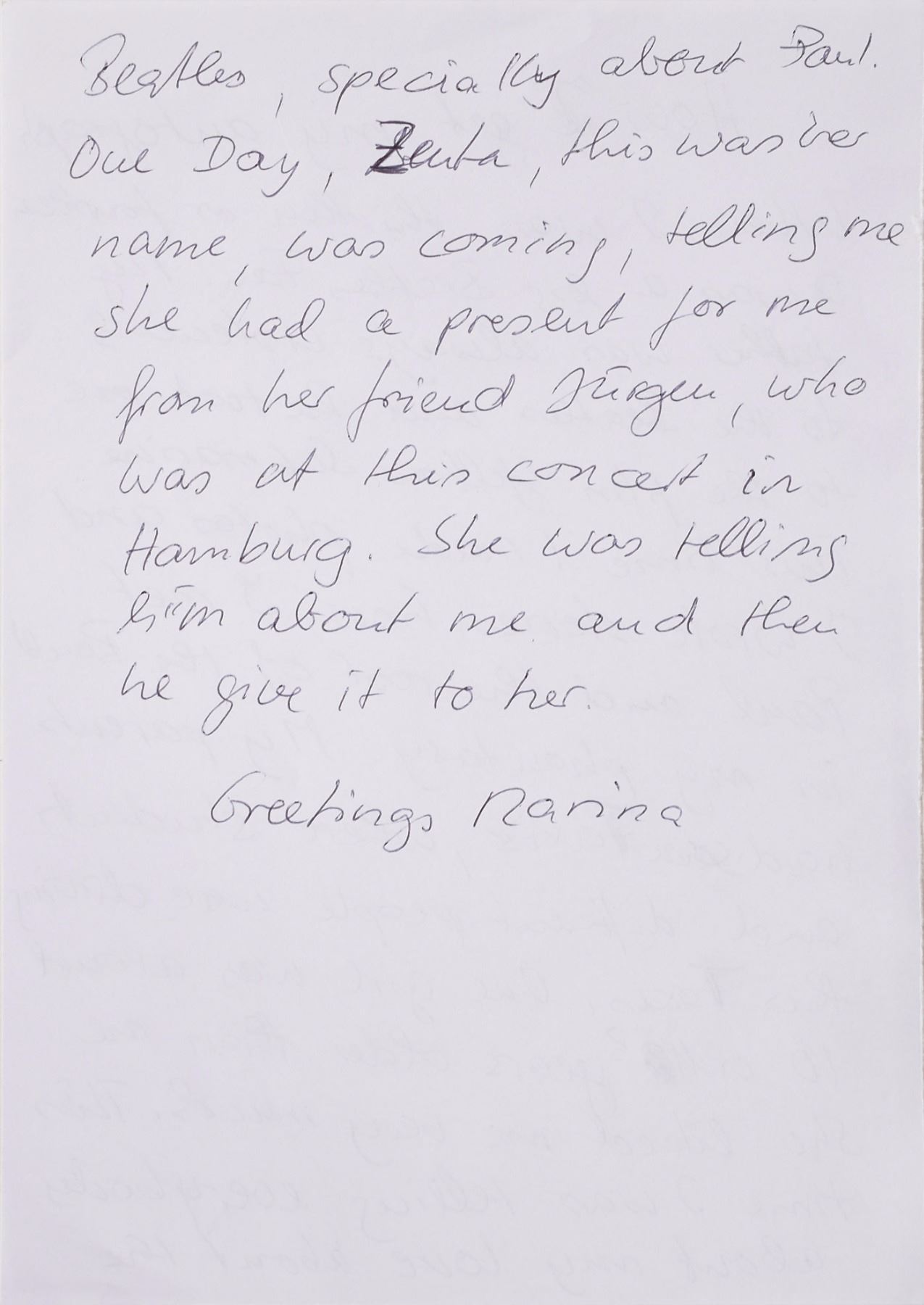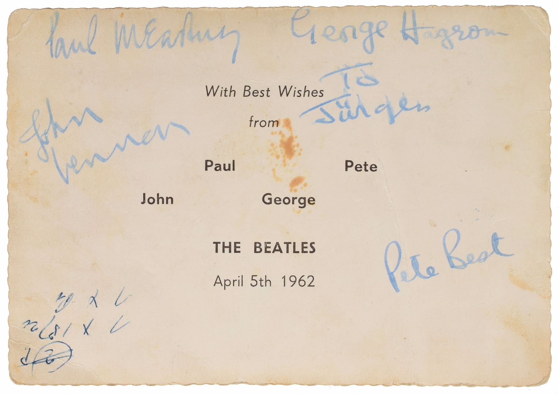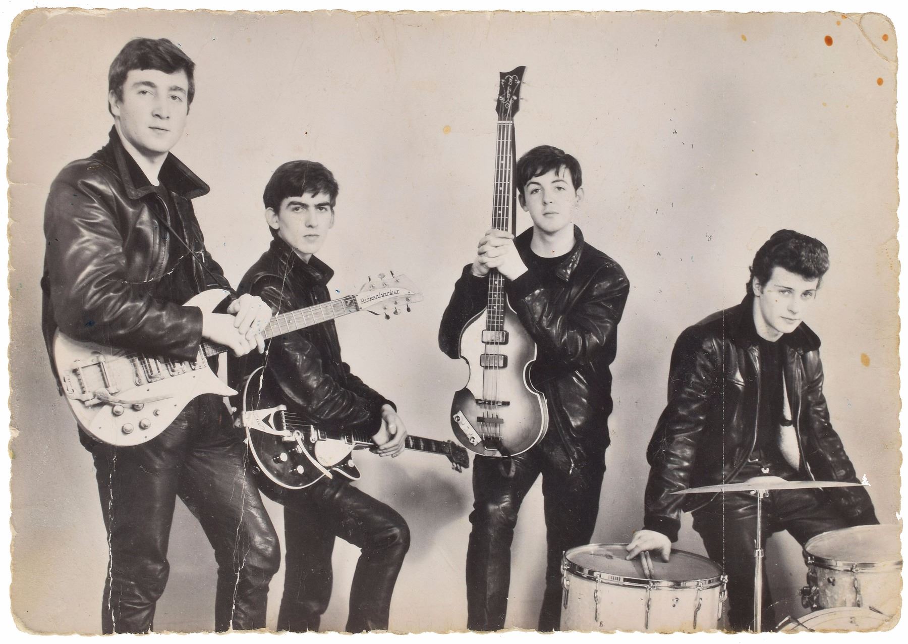 Very rare vintage glossy 5.75 x 4 deckle edge promo photo showing the leather-clad Beatles with Pete Best on drums, with printed text on the reverse: "With Best Wishes from Paul, Pete, John, George, The Beatles, April 5th 1962." Signed and inscribed on the reverse in blue ink, "George Harrison, To Jurgen," "Paul McCartney," "John Lennon," and "Pete Best." In very good to fine condition, with some creasing (a vertical crease passes through Best's signature), and some light staining and soiling. Accompanied by a letter of provenance from the original owner, in part: "When I was thirteen or fourteen I was a big Beatles fan…My parents had some Taxis, where students and different people were driving this Taxis. One girl was around 10 or 11 years older than me…This time I was telling everybody about my love about the Beatles, specially about Paul. One day, Zenta…was coming, telling me she had a present for me from her friend Jurgen, who was at this concert in Hamburg. She was telling him about me and then he give it to her." On April 5, 1962, the Beatles played a concert at the Cavern Club specially arranged by the band's Liverpool fan club. The group performed two high-energy sets, dressing in old leather jackets and trousers for the first before changing into their modish Beno Dorn suits and ties before the second. Less than two weeks later, the Beatles served as the opening act at the launch of the Star-Club in Hamburg on April 13, 1962, and stayed on with the venue until the end of May. The next time the Beatles played the Star Club in early November, Ringo Starr had replaced Pete Best as the band’s full-time drummer, forever solidifying the classic Fab Four lineup.