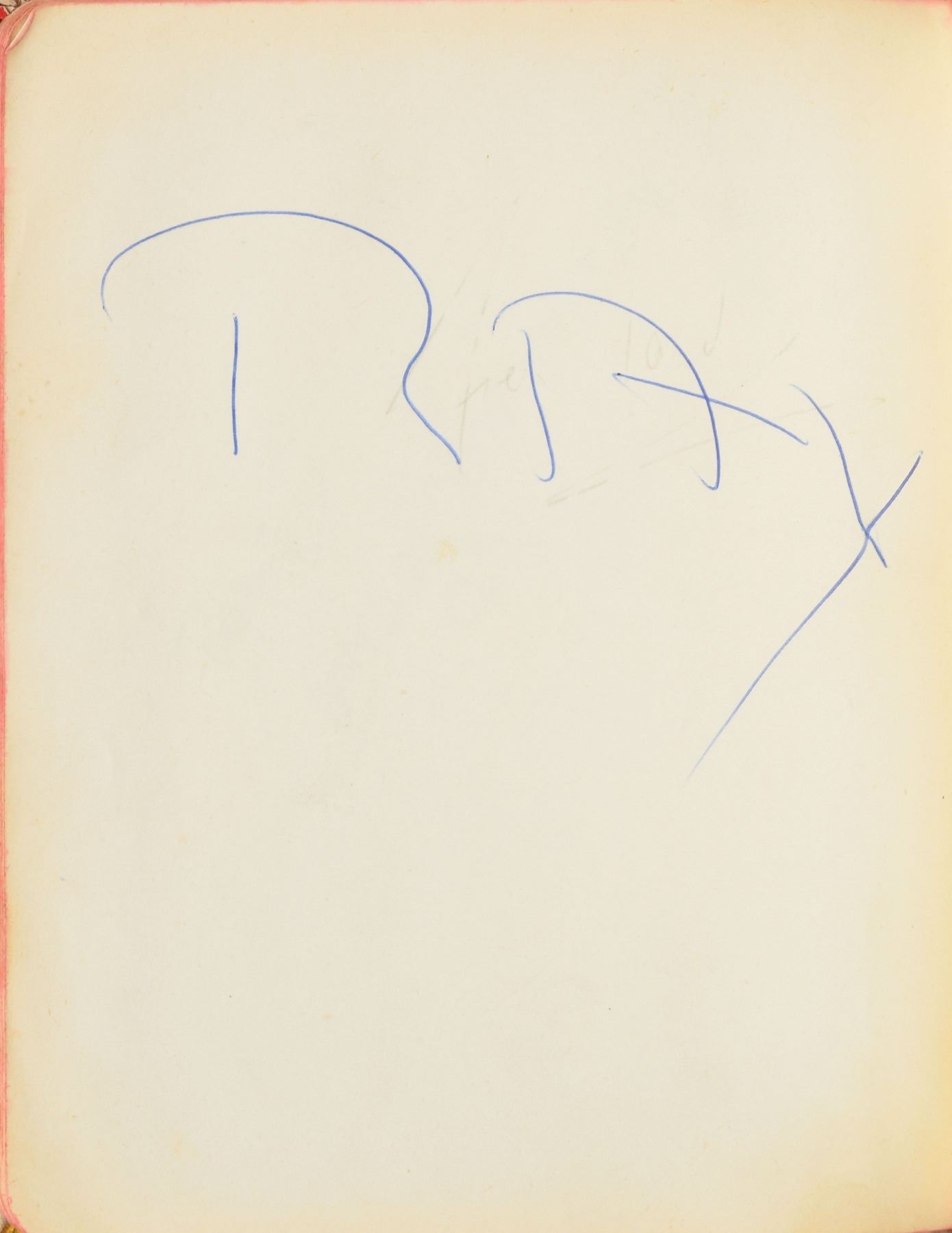 Amazing vintage autograph book, 5.5 x 6.75, signed inside on the same page in blue ballpoint, "Beatles, John Lennon," "George Harrison," "Paul McCartney," and "Ringo Starr," and then several pages earlier in blue ballpoint, "Ray." In fine condition, with wear and soiling to the covers of the album; interior pages are clean.