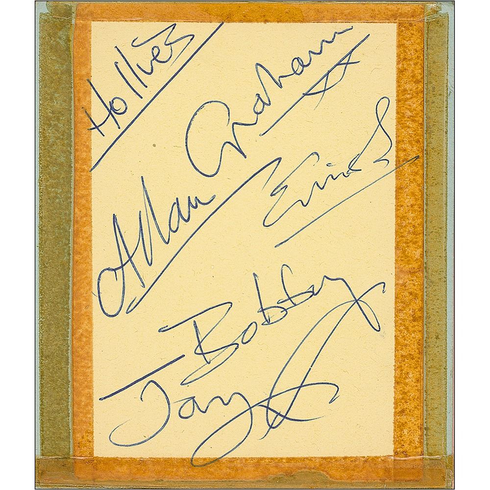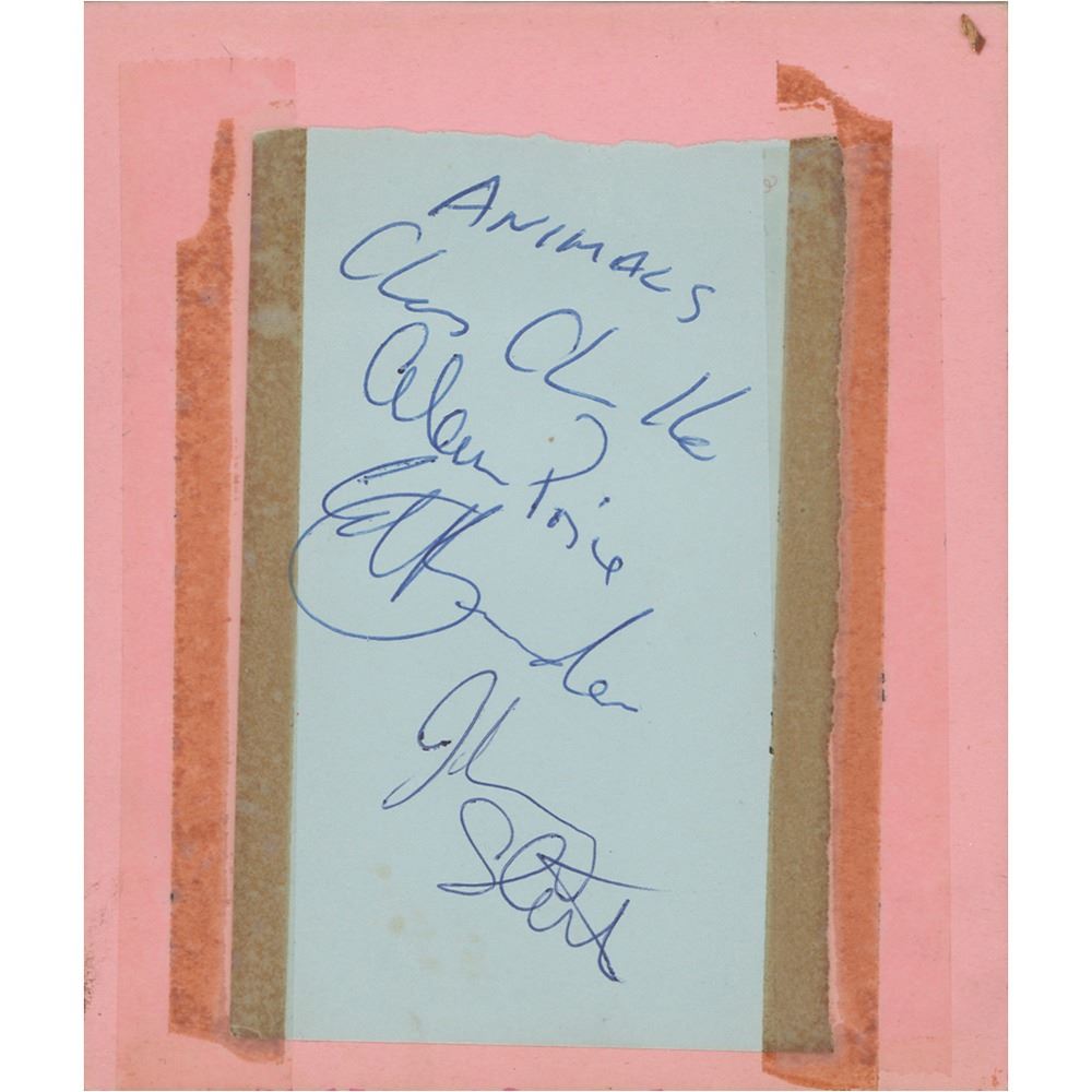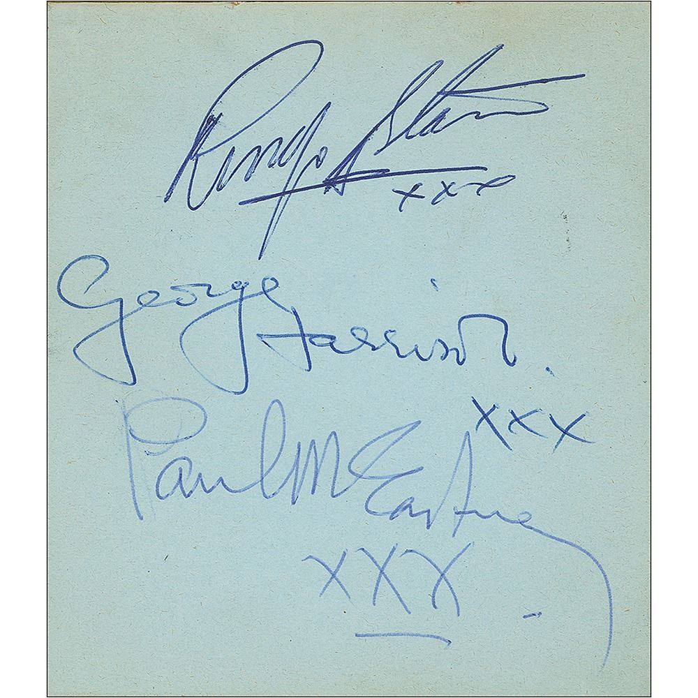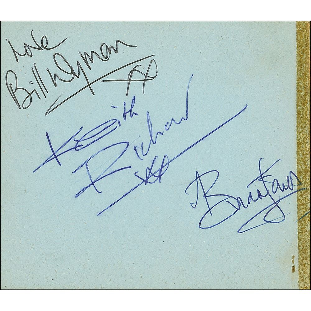 Bold vintage ballpoint signatures of the Beatles, "John Lennon, xxx, To Karen, with love," "Ringo Starr xxx," "George Harrison xxx," and "Paul McCartney xxx," on adjacent off-white and light blue 4.75 x 4 album pages, still contained in their original hardcover autograph album. Other signers in the album, some of which are on slips and cards affixed to the album's pages, include: Bill Wyman, Keith Richards, and Brian Jones of the Rolling Stones; Chuck Berry (ins); Carl Perkins; Chas Chandler, Alan Price, Eric Burdon, and Johnny Steel of the Animals; another set of Animals signatures from Hilton Valentine, Eric Burdon, Dave Rowberry, Chas Chandler, and John Steel; signatures of Graham, Allan, Eric, Bobby, and Tony of the Hollies (all signing first name only); all four members of Gerry and the Pacemakers; the Countrymen; the Dakotas; the Monotones and others. The Beatles' signatures are in fine condition; the remainder of the signatures are very good to fine, with old tape remnants and toning. Album also rates very good, with missing spine (repaired with tape), loose binding, and owner's address labels ("Miss Karen Elliott, 15 Anerley Road, Westcliff-on-Sea, Essex") affixed to inside front cover. Karen was an adept autograph hunter—in the back of the book, she wrote down the license plate numbers of the stars so that she could track them down. Among the names listed are John Lennon, Eric Burdon, and Hilton Valentine, with several items crossed out. To have such a great multitude of vintage British bands in a single autograph book is incredibly desirable, and the presence of Chuck Berry—one of the biggest early influences on the Beatles and Rolling Stones—makes it that much more special.