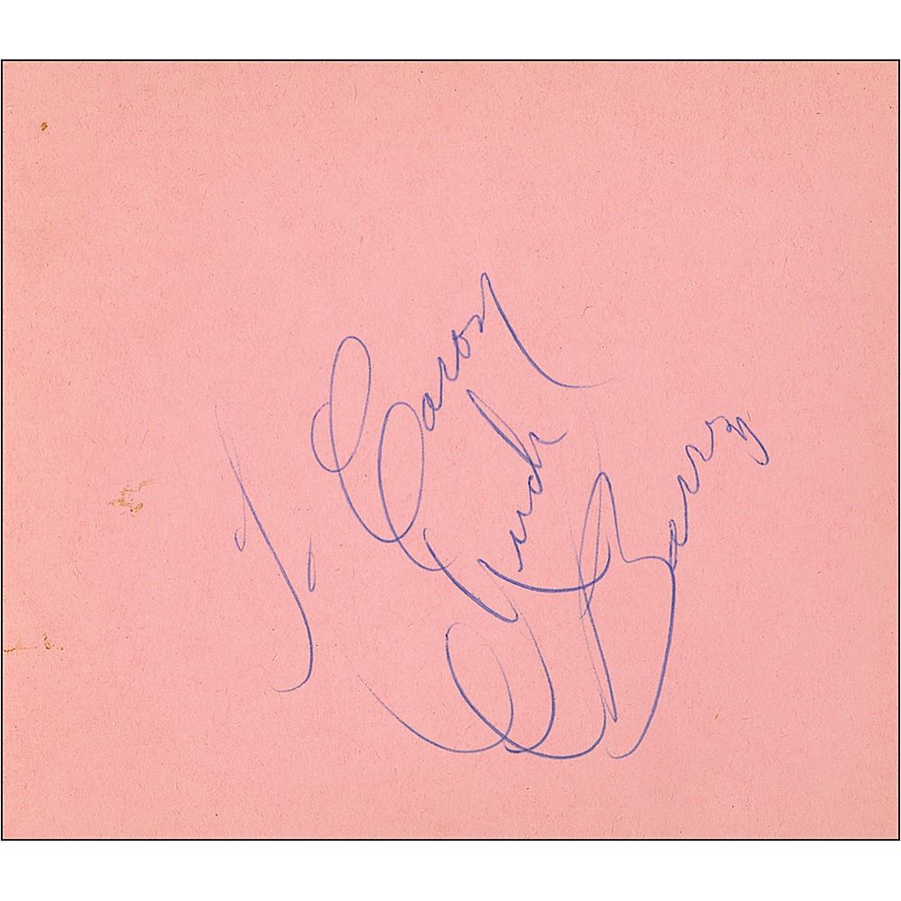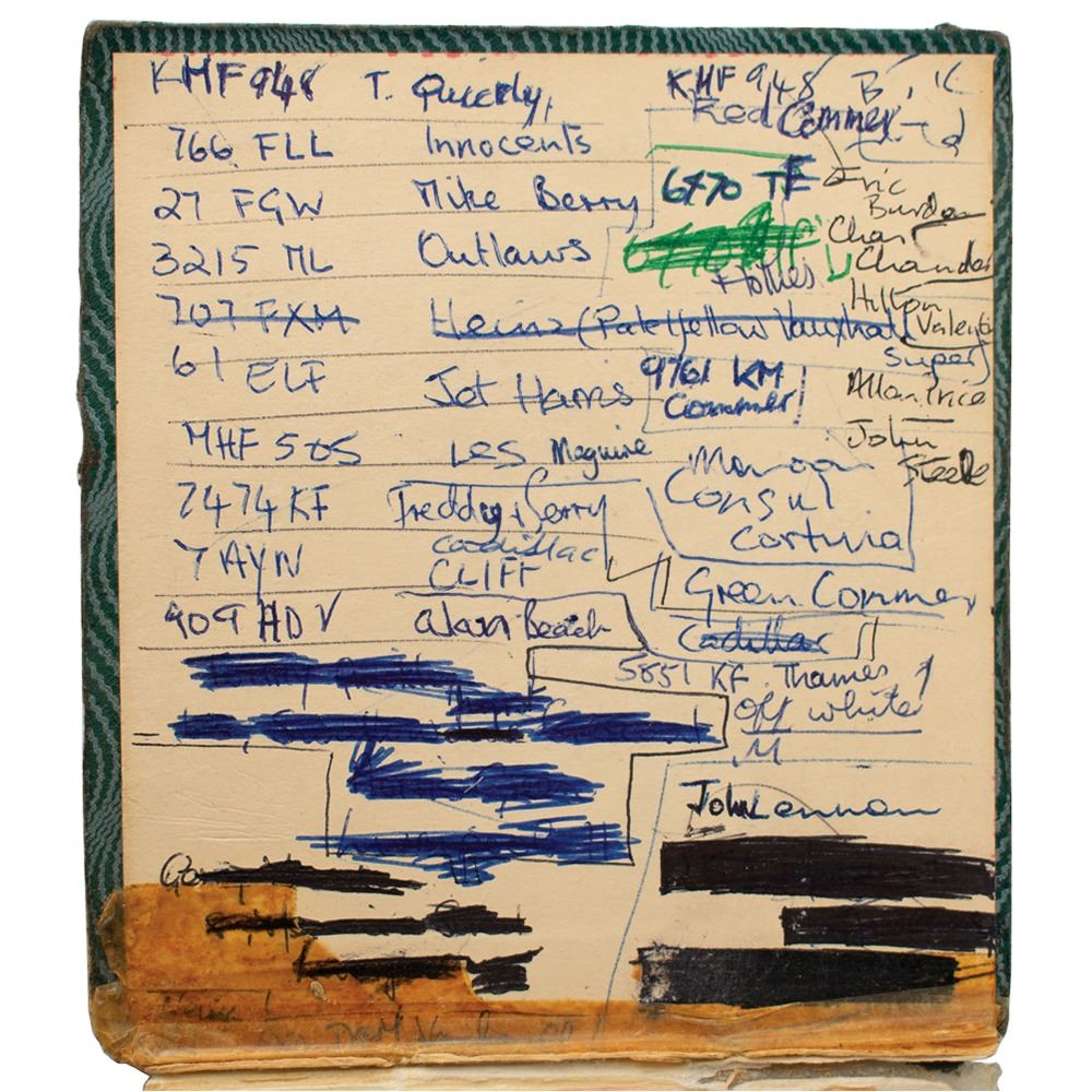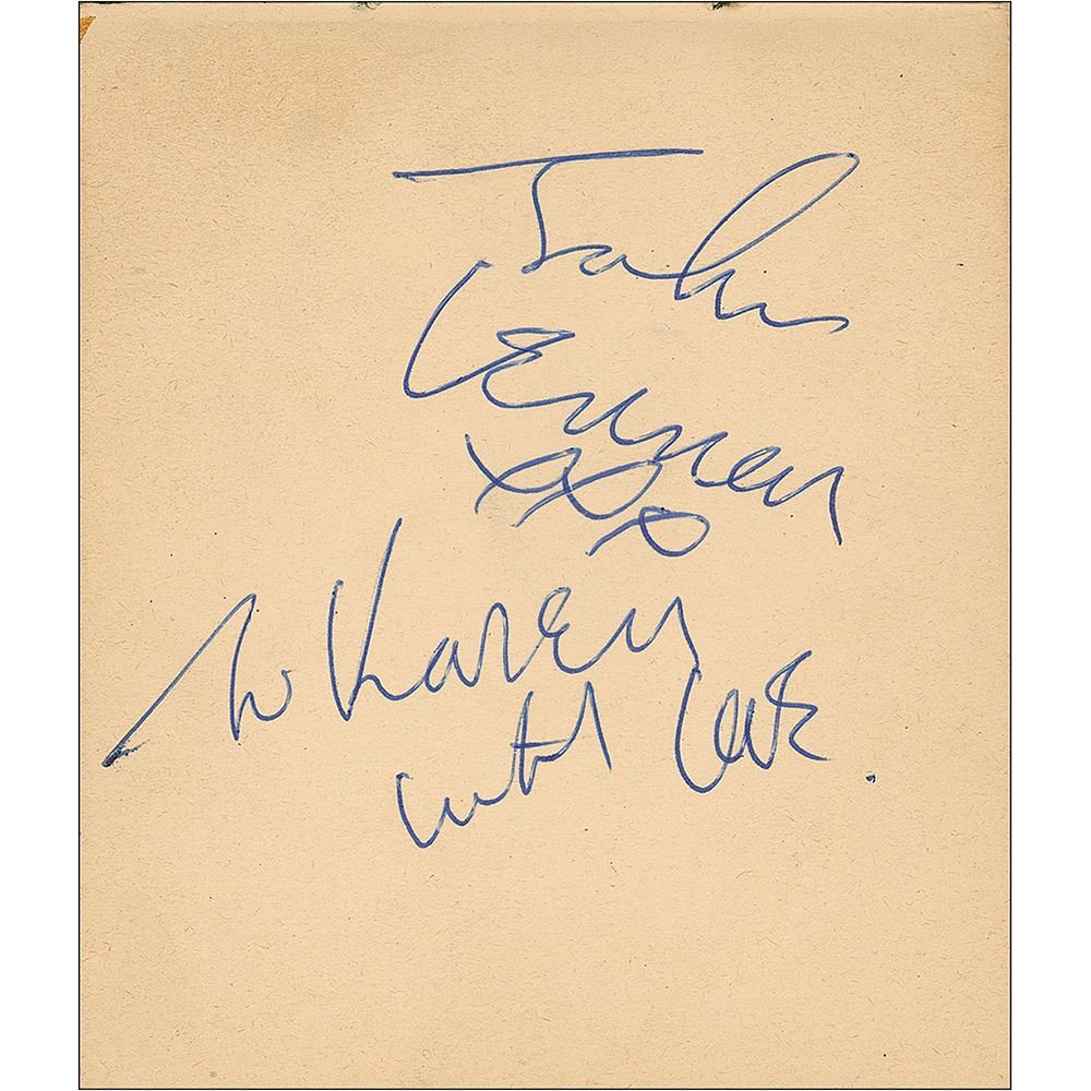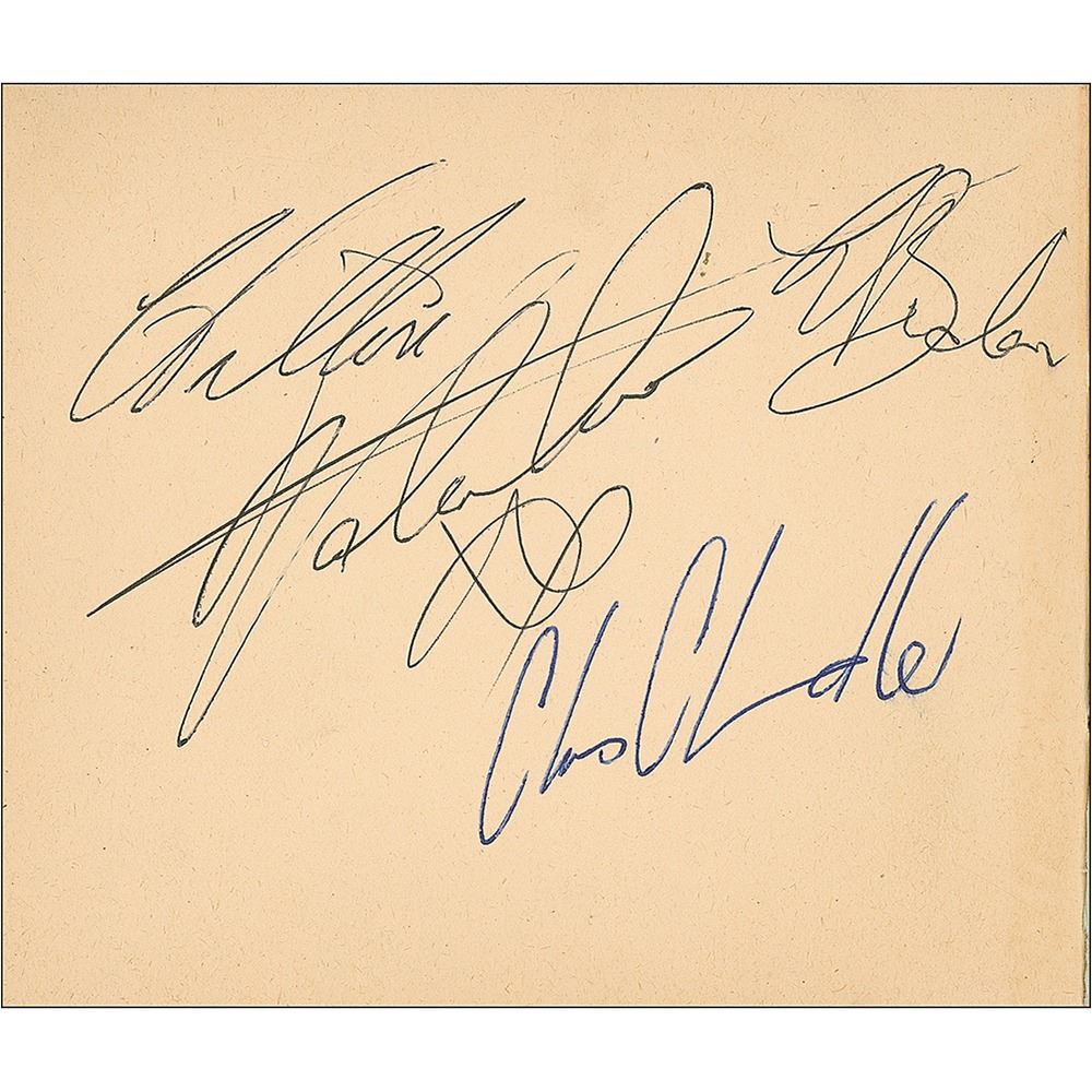 Bold vintage ballpoint signatures of the Beatles, "John Lennon, xxx, To Karen, with love," "Ringo Starr xxx," "George Harrison xxx," and "Paul McCartney xxx," on adjacent off-white and light blue 4.75 x 4 album pages, still contained in their original hardcover autograph album. Other signers in the album, some of which are on slips and cards affixed to the album's pages, include: Bill Wyman, Keith Richards, and Brian Jones of the Rolling Stones; Chuck Berry (ins); Carl Perkins; Chas Chandler, Alan Price, Eric Burdon, and Johnny Steel of the Animals; another set of Animals signatures from Hilton Valentine, Eric Burdon, Dave Rowberry, Chas Chandler, and John Steel; signatures of Graham, Allan, Eric, Bobby, and Tony of the Hollies (all signing first name only); all four members of Gerry and the Pacemakers; the Countrymen; the Dakotas; the Monotones and others. The Beatles' signatures are in fine condition; the remainder of the signatures are very good to fine, with old tape remnants and toning. Album also rates very good, with missing spine (repaired with tape), loose binding, and owner's address labels ("Miss Karen Elliott, 15 Anerley Road, Westcliff-on-Sea, Essex") affixed to inside front cover. Karen was an adept autograph hunter—in the back of the book, she wrote down the license plate numbers of the stars so that she could track them down. Among the names listed are John Lennon, Eric Burdon, and Hilton Valentine, with several items crossed out. To have such a great multitude of vintage British bands in a single autograph book is incredibly desirable, and the presence of Chuck Berry—one of the biggest early influences on the Beatles and Rolling Stones—makes it that much more special.
