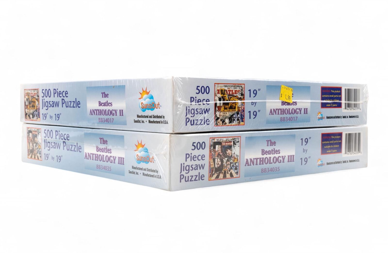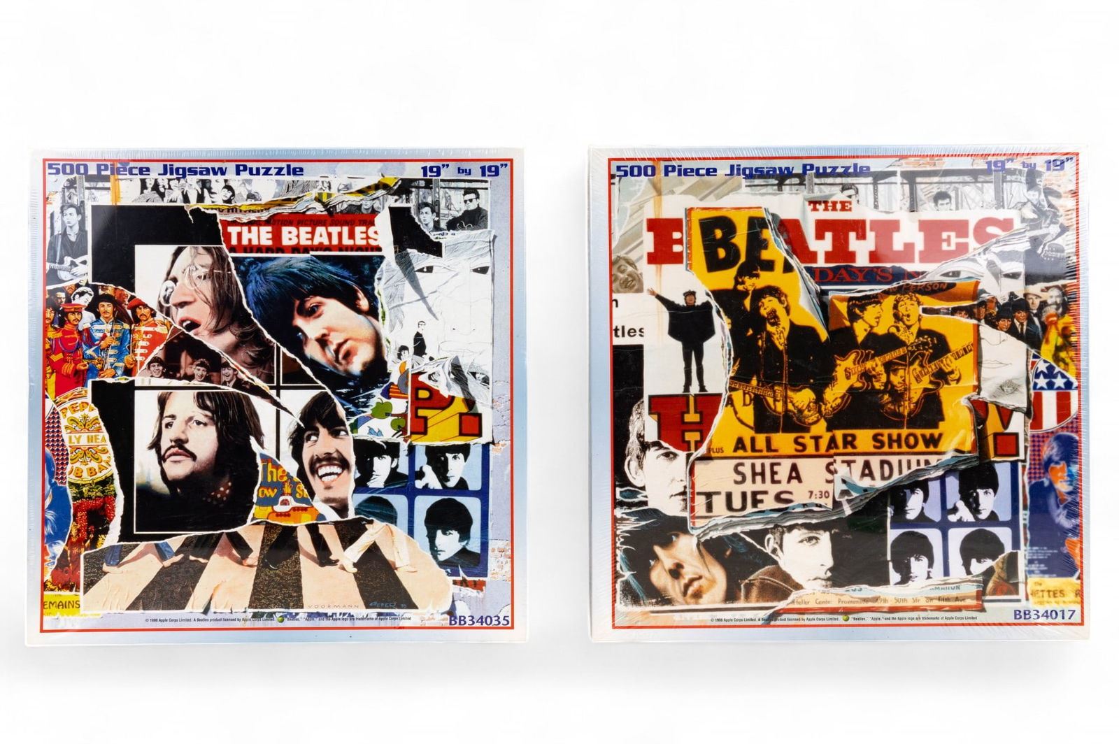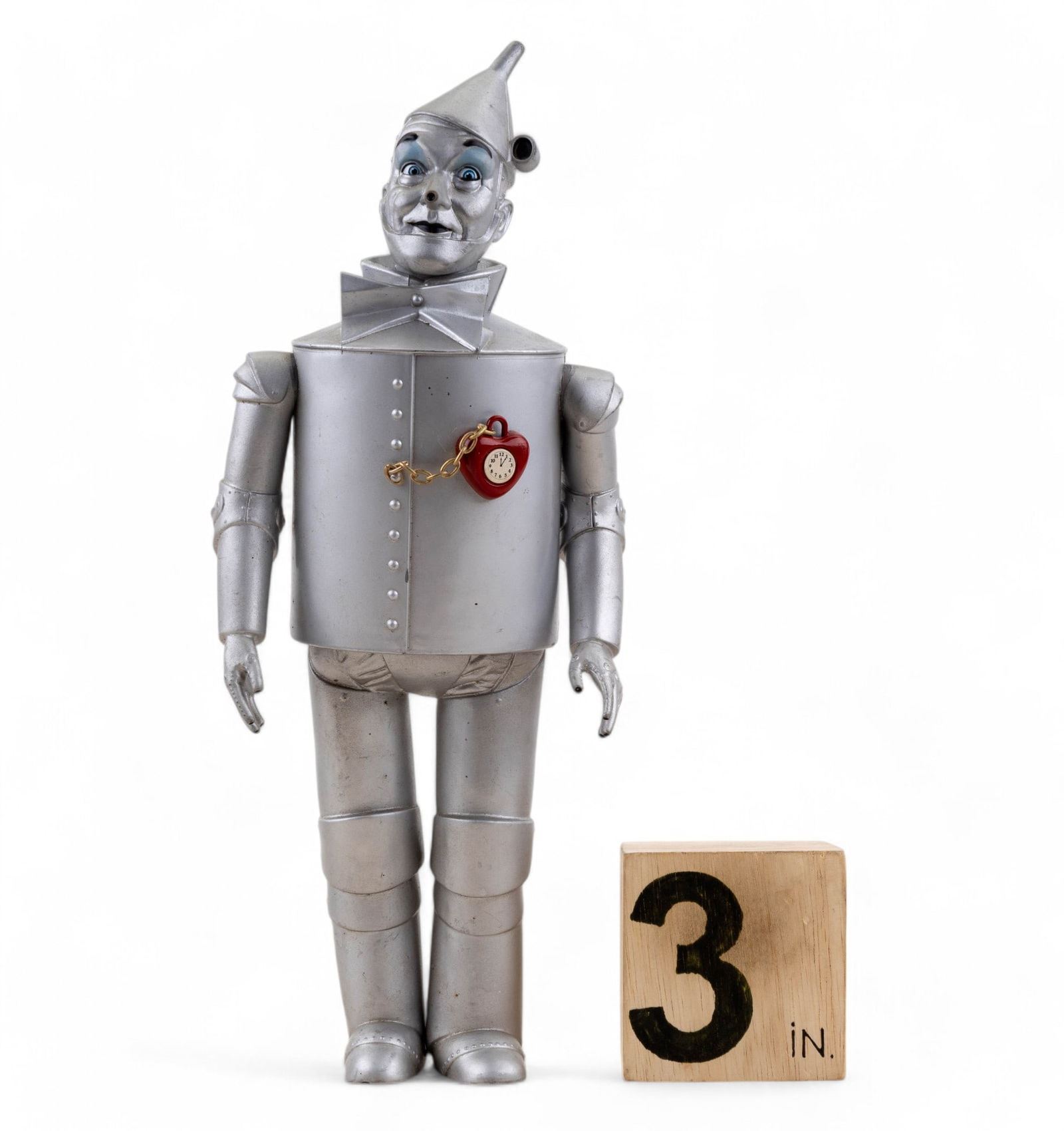 Highlights include a vintage Yellow Submarine 4" button with some wear and loss and a vintage plastic Tin Man doll measuring approx. 14" H with some wear. 2 Beatles unopened 500 piece, 19" x 19" jigsaw puzzles and a sepia tone Wizard of Oz group photo.