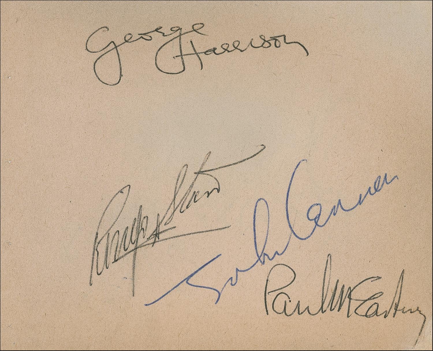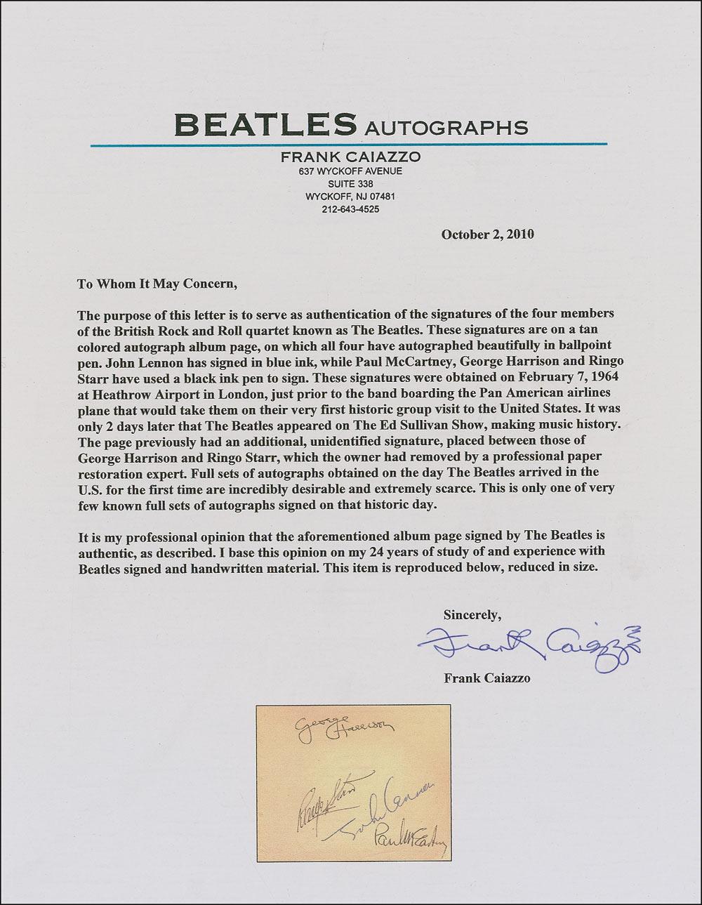 Vintage blue ballpoint signatures, “George Harrison,” “Ringo Starr,” and “Paul McCartney,” and a blue ballpoint signature “John Lennon,” on an off-white 6 x 4.5 album page. These signatures were obtained on February 7, 1964, at Heathrow Airport in London, just prior to the group flying to the United States for the first time. Just two days after signing, the band would appear on the Ed Sullivan Show, making music history. The page originally had an additional unknown signature between Harrison’s and Starr’s which has been removed by a professional paper restoration expert. In fine condition, with a uniform shade of toning to page, aforementioned removed signature, and some light traces of removed signatures on the reverse of the page. Accompanied by a letter of authenticity from noted Beatles expert Frank Caiazzo, giving the history of the signatures which reads, in part: “Full sets of autographs on the day The Beatles arrived in the U.S. for the first time are incredibly desirable and extremely scarce. This is only one of a very few known full set of autographs signed on that historic day.” A fantastic set of signatures, on a larger album page than usually seen, tied to one of the most important dates in rock and roll history.