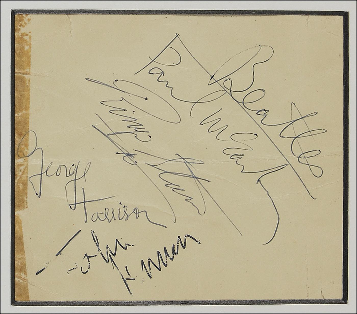 Vintage ballpoint signatures, “Beatles, Paul McCartney,” “Ringo Starr,” “George Harrison,” and “John Lennon,” on a light yellow album page. Matted and framed with a photo of the Fab Four exiting their airplane, to an overall size of 13.25 x 20.5. Moderate intersecting folds and creases passing through all signatures, old tape toning along left edge affecting first stroke of Harrison’s signature, and some skipping to Lennon’s signature, otherwise very good condition. Accompanied by a letter of provenance from the original recipient of the signatures, who acquired them by sneaking backstage in between shows at the Coventry Theatre on February 24, 1963: “We were in luck all the way along and through another door into backstage. Immediately in front of us there they stood talking to Kenny Lynch, The Beatles themselves. They had seen us come out of the door so we went up to them and started to talk to them. We asked for their autographs which they gave to us.”