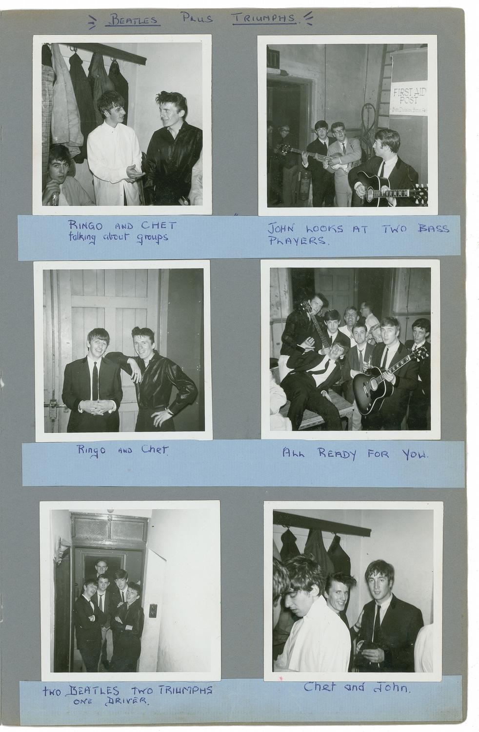 Unique and fantastic gray scrapbook page, 9 x 14, featuring a semi-circular clipped early photo of the band, signed underneath the image in blue ballpoint, “George Harrison (bass),” “Paul McCartney (at the back),” “John Lennon (away ye go!)”, and “Ringo Starr drums,” with McCartney adding an inscription under the signatures, “All the best in the future Chet! Keep swinging!!” Affixed below the signatures is another clipped photo and caption. Inside of the gatefold of signed page and second integral page bears a 5 x 8 promotional handbill for The Pavilion in Bath, featuring the Beatles appearing on June 10th, along with the Colin Anthony Combo, and Chet and the Triumphs, the recipient of the signatures on the preceding page, as well as two business cards for Chet and the Triumphs. Opposite page bears six original candid glossy snapshots of Chet and various members of the Beatles, including photos of Chet posing individually with John Lennon and Ringo Starr, with captions written under each photo in an unknown hand. Reverse of second page bears an affixed signed and inscribed photo of Darcy Sheldon. In fine condition, with some mild edge toning and creasing, and light handling wear.