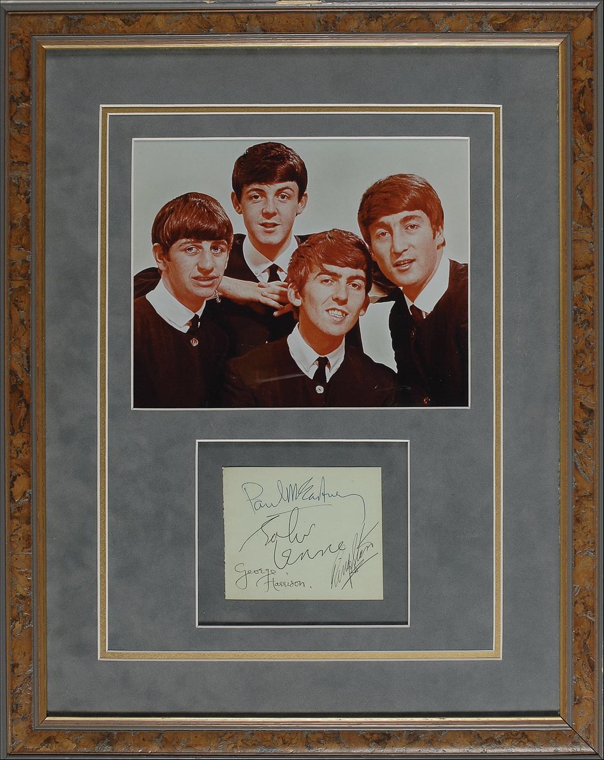 Exceptional vintage black ballpoint signatures, “John Lennon,” “George Harrison,” and “Ringo Starr,” and blue ballpoint signature, “Paul McCartney,” on a light green album page. Triple suede matted and framed with a color glossy 10 x 8 photo of the Fab Four to an overall size of 17.25 x 21.5. In fine, clean, bright condition, with a trivial brush to opening stroke of McCartney’s signature, and a couple overlapping strokes. Sets of Beatles signatures this nice are few and far between!