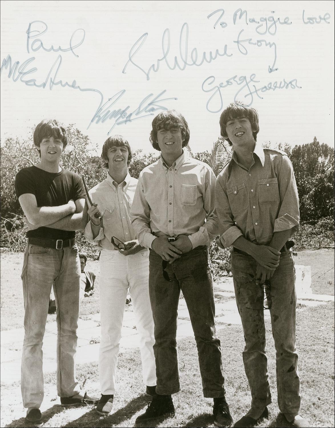 Vintage glossy 8 x 10 photo of the casually dressed Fab Four on a beach in the Bahamas during the filming of Help, signed and inscribed in black felt tip “To Maggie, love from George Harrison,” “Paul McCartney,” “John Lennon,” and “Ringo Starr.” A few trivial light creases and surface marks, all writing slightly faded but still bold, and light show-through of horizontal lines on the reverse from prior storage in a magnetic photo album, otherwise fine condition. Uncommon in this size and a very appealing example Michael Peto’s collection, the photojournalist who was commissioned to shoot still photos during the filming of the movie. After 1963, The Beatles became less accessible to fans, making this inscribed photo a legendary marker of when Beatlemania ruled the world.