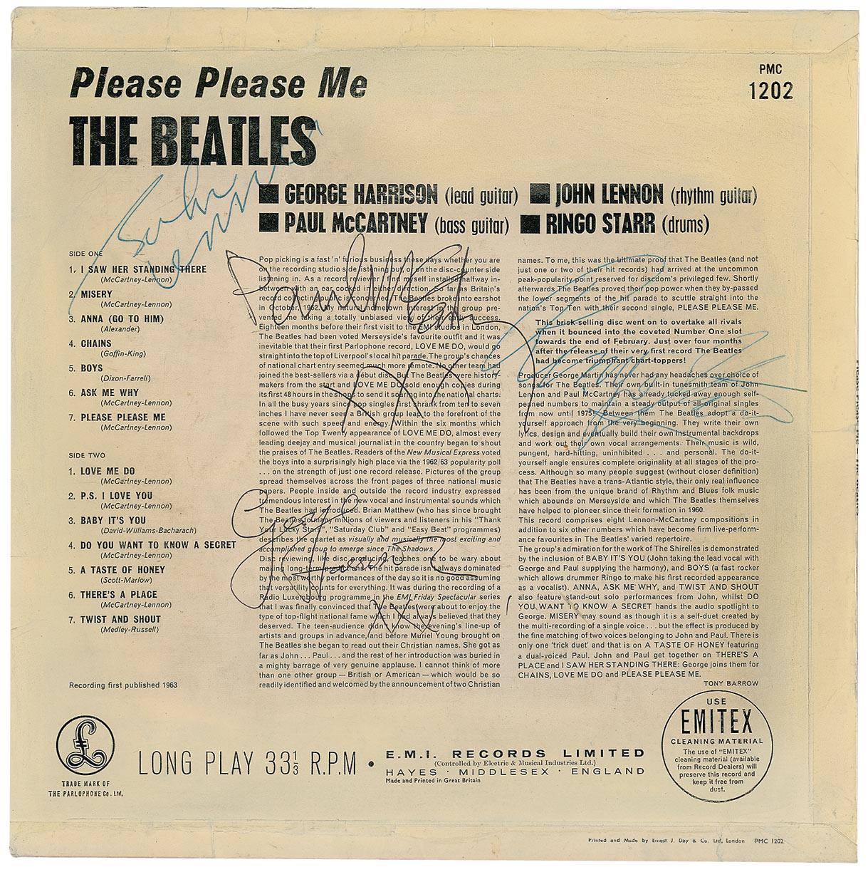 Please Please Me album signed on the back cover in blue ballpoint, “John Lennon,” and “Ringo Starr,” and in black ballpoint, “Paul McCartney xxx,” and “George Harrison xxx.” The back cover has benefitted from tasteful and unobtrusive professional cleaning, and the album is in very good to fine condition, with uniform mild toning and some scattered light creases to back cover, and creasing and soiling to front cover. The record is not included. Accompanied by a certificate of authenticity from Tracks stating that the “autographs were obtained at the Gaumont Cinema, Worcester, England on September 4th, 1963.” Any album signed by all four members is highly desirable, with only roughly 75 signed copies of this title known to exist.