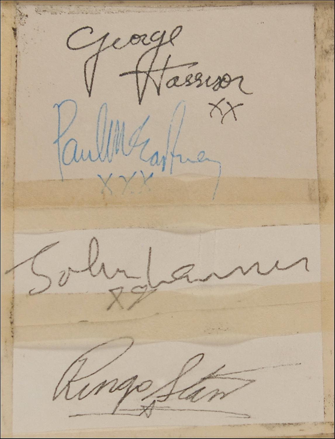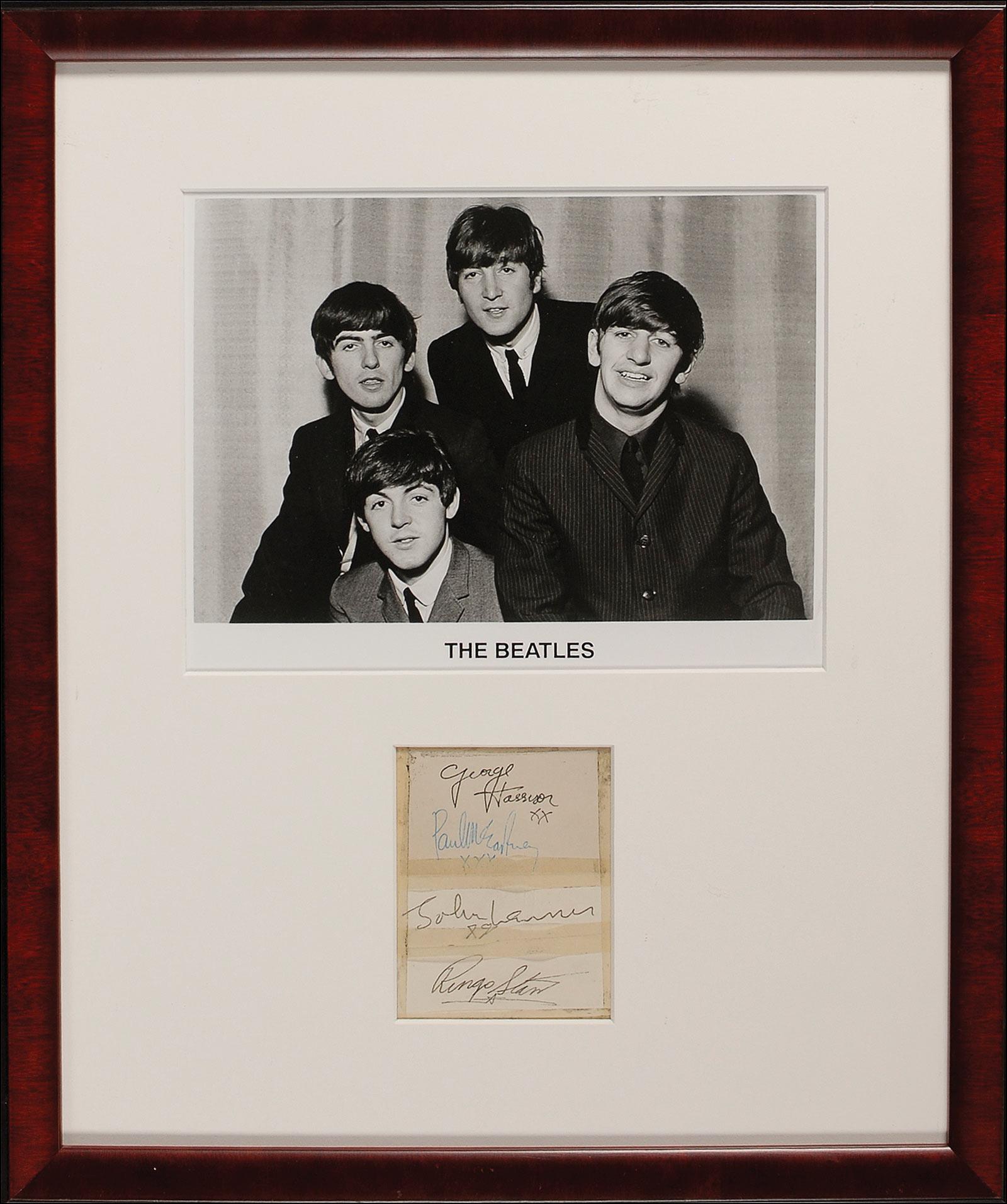 Vintage ink and ballpoint signatures, “George Harrison xx,” “Paul McCartney xxx,” “John Lennon xx,” and “Ringo Starr,” on three off-white slips taped together to an overall size of 3.25 x 4.25. Matted and framed with a portrait of the Fab Four, to an overall size of 15.25 x 18.5. In very good condition, with two horizontal pieces of tape connecting slips, with tape over small portions of Lennon and McCartney’s signatures, tape around edges, a bit of light soiling, and two small vertical creases through a single letter of Lennon’s signature. Accompanied by a certificate of authenticity from Perry Cox.