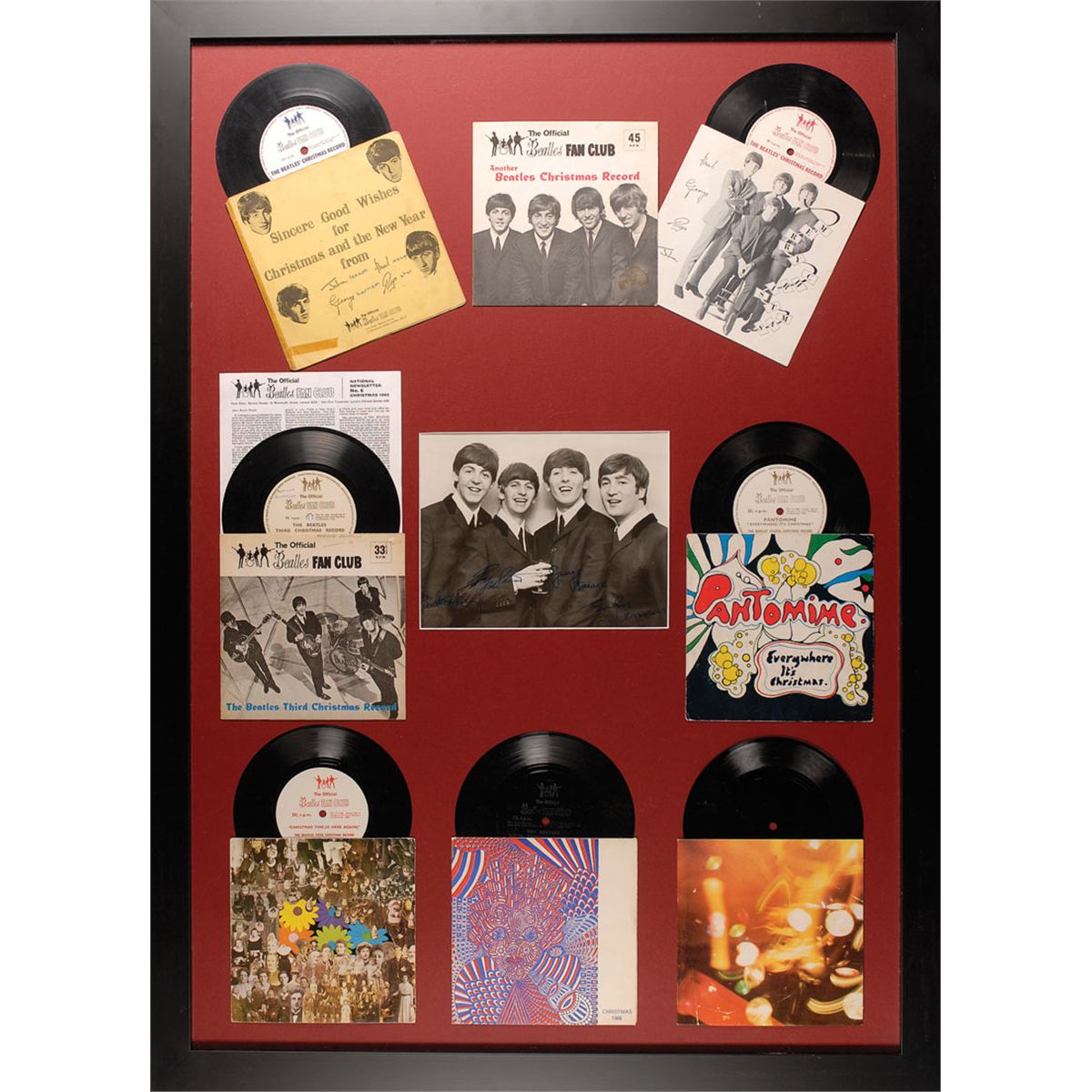 A complete set of seven UK pressing Beatles Christmas records sent to members of their official fan-clubs in the United Kingdom and the United States. Matted and framed with their original sleeves, to an overall size of 30.5 x 42.25. In VG to Mint-condition. One such record was issued each year from 1963 to 1969 and an LP compilation of all seven in 1970. Conceived as a means to appease fan-club members whose letters, due to their sheer volume, were not always being answered in a timely manner, the records included the Beatles' messages of thanks to ‘loyal Beatle people,’ along with skits, Christmas carols, and original compositions. None of the original recordings has ever been subject to general release though a version of ‘Christmas Time is Here Again,’ appeared in edited form on the 1967 record, eventually gained an official release in 1995, as part of the The Beatles Anthology project.