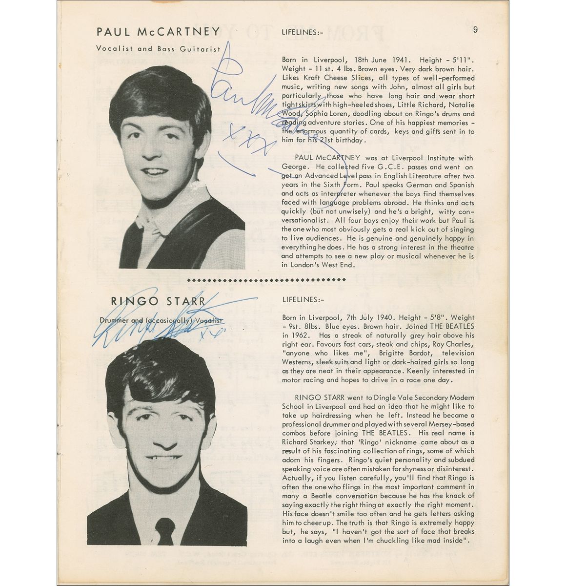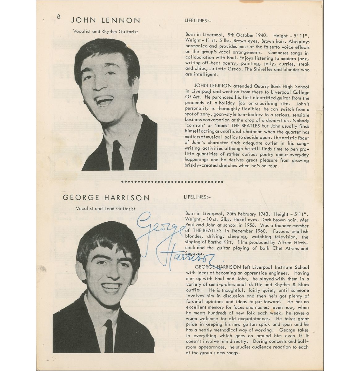 Original vintage Fabulous Beatles Souvenir Song Album, 8.5 x 11, 27 pages. Signed on the front cover in blue ballpoint, “John Lennon,” and inside next to their respective images and biographies, “George Harrison,” “Paul McCartney xxx,” and “Ringo Starr xx.” In very good condition, with skipping to Lennon’s signature due to lamination on cover, a few partially separated pages inside, light wrinkling, edge tears, and creasing to covers, a few pencil notations inside, as well as a previous owner’s signature. Accompanied by a letter of authenticity from noted Beatles expert Frank Caiazzo stating “These signatures date from late 1963, and are all excellent and complete examples from this time period, which was only a few short months before the Beatles came to America for their first triumphant visit.” Also accompanied by a certificate of authenticity from Roger Epperson/REAL, as well as an unsigned copy of a Meet The Beatles magazine. Not long after signing this album, the Beatles left for their first trip to the United States, appearing on the Ed Sullivan Show on February 9, 1964. A fine example on a seldom-seen album.