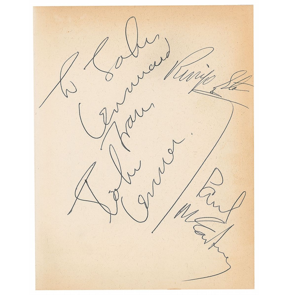 Signed book: In His Own Write. First edition. London: Jonathan Cape, 1964. Hardcover, 5.5 x 7, 78 pages. Signed and inscribed in black ballpoint on the first free end page, “To John Lennard from John Lennon and” and “Ringo Starr,” and “Paul McCartney.” In fine condition, with mild edge toning to signed page and both pastedowns, and scattered surface wear, dings, and impressions to covers. Lennon found avenues other than music to express his creativity. This specific literary effort—his first published work and the first solo effort of any of the Beatles—consisted of nonsensical, disjointed short stories and line drawings. Quite uncommon to see other members of the Beatles signing Lennon’s work.