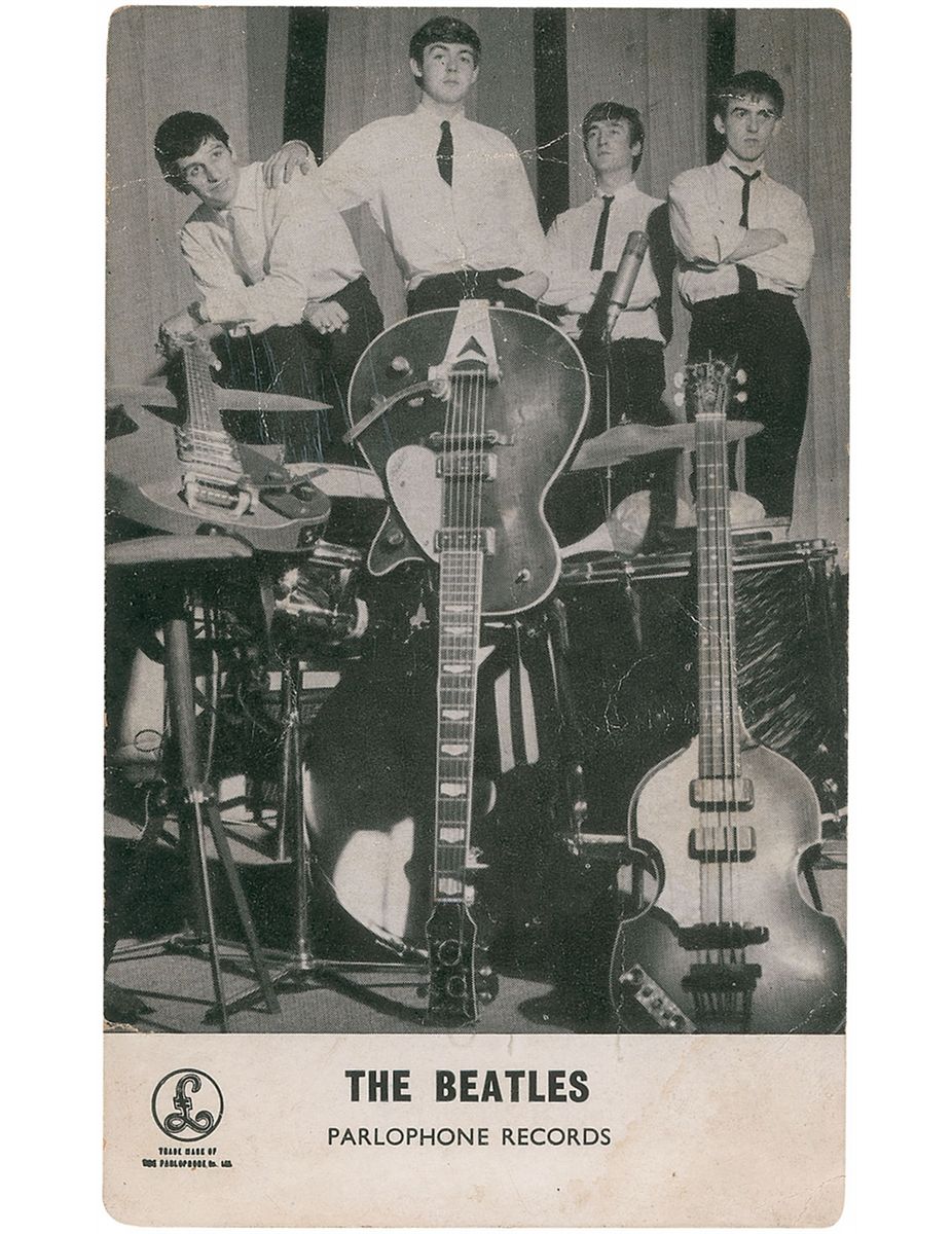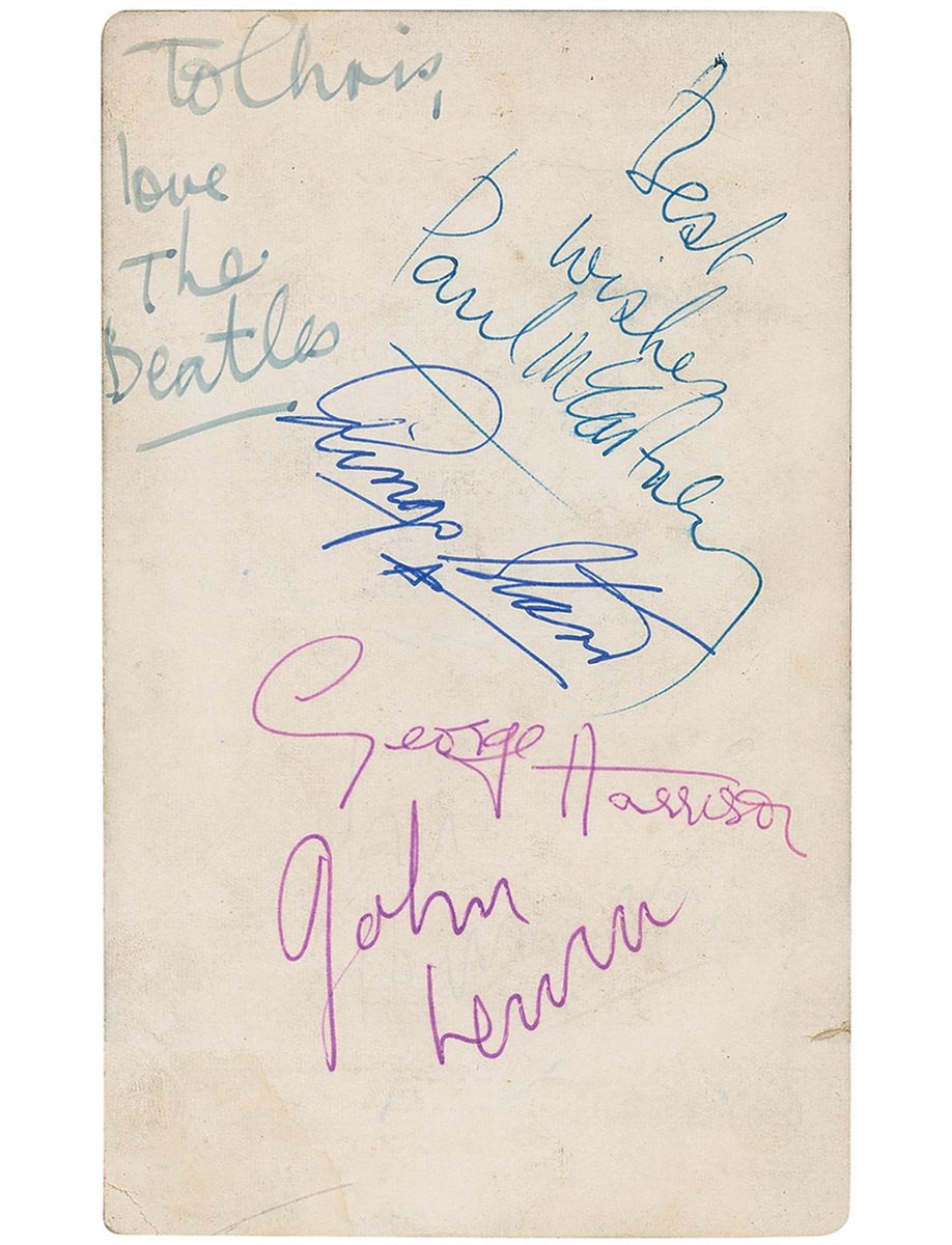 Vintage 3.5 x 5.75 Parlophone postcard photo, signed on the reverse in blue ballpoint, “Best wishes, Paul McCartney,” and “Ringo Starr,” and in purple ballpoint, “George Harrison,” and “John Lennon.” McCartney has also added an inscription in fountain pen, “To Chris, love the Beatles.” Scattered creases and soiling, more prevalent on reverse, and a trivial tear to one edge, otherwise fine condition. Photo on the front was originally taken by Dezo Hoffman while the Beatles were recording ‘Love Me Do’ at EMI Studios in London on September 4, 1962. A truly outstanding set of signatures acquired prior to the explosion of Beatlemania.