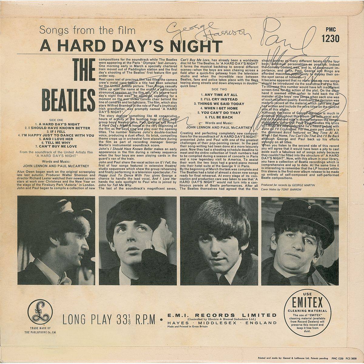 A Hard Day’s Night soundtrack album signed on the back cover in black ballpoint, “George Harrison,” “Paul McCartney,” “John Lennon,” and “Ringo Starr.” Scattered toning and foxing to back cover, and scattered creases and surface marks to front cover, otherwise fine condition. The record is included. Accompanied by a full letter of authenticity from PSA/DNA, grading the Lennon, McCartney, and Starr signatures “8,” and the Harrison signature a “9.” Also accompanied by a letter of authenticity from noted Beatles expert Frank Caiazzo, which reads, in part: “These signatures date from 1964, shortly after the album was released. ‘A Hard Day’s Night’ is a highly desirable title to have signed by the Beatles…the ultimate in any true fan’s collecting experience…very few documented examples of ‘A Hard Day’s Night’ autographed by the Beatles exist, and in fact, only 6 copies of this extremely rare and desirable title signed by the band have surfaced to date.”