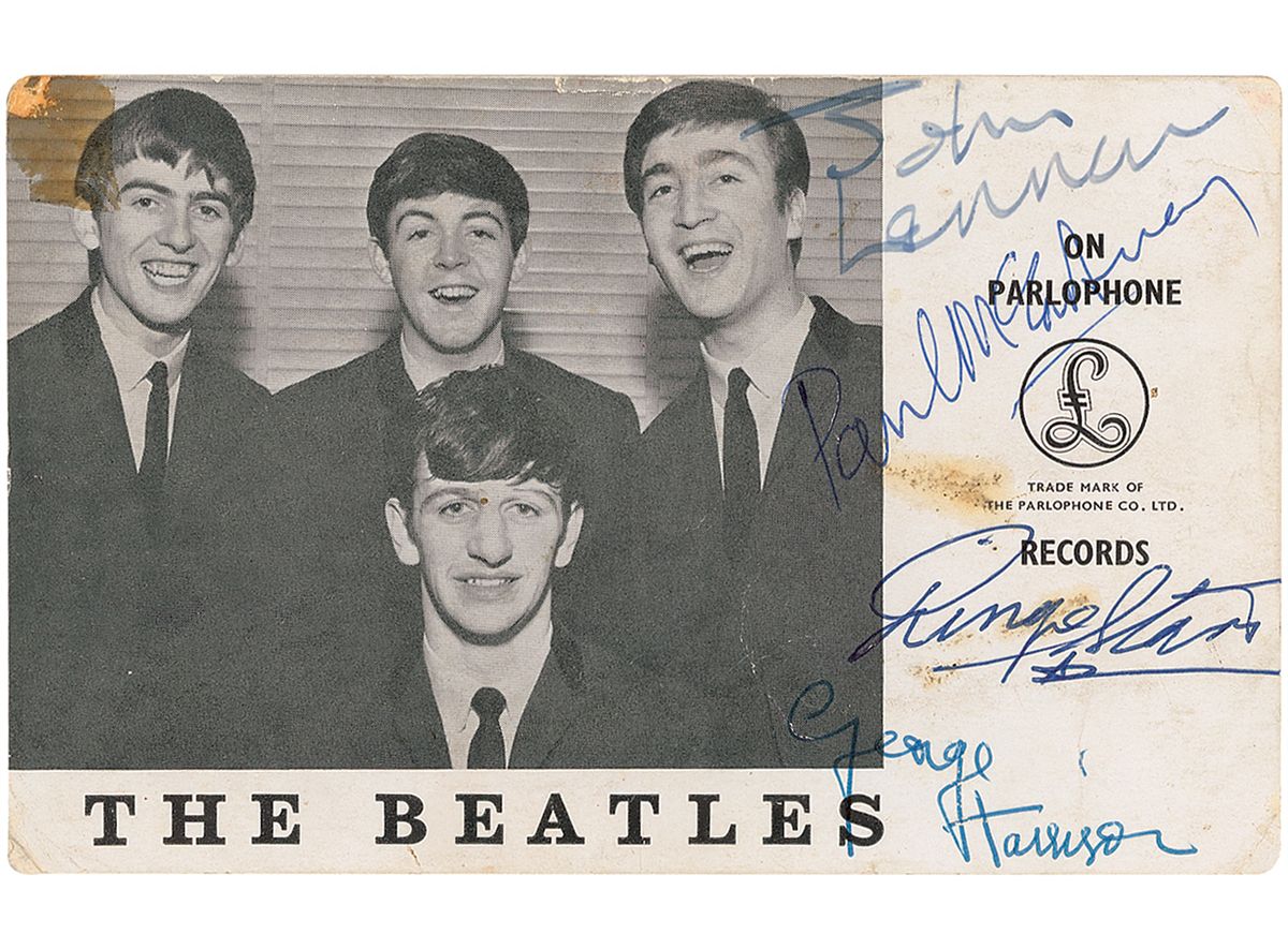Vintage 5.75 x 3.5 Parlophone Records promotional photo from March of 1963, signed in blue ballpoint, “Paul McCartney,” “Ringo Starr,” and “George Harrison,” and in fountain pen, “John Lennon.” In very good condition, with some light creases and surface impressions, some light staining to right side, some lightly affecting Ringo’s signature, old tape remnant to top left, and mounting remnants to reverse. Accompanied by a letter of authenticity from noted Beatles expert Frank Caiazzo stating the signatures date from April of 1963. A scarce fan club card as most of these were signed by the band’s managers or secretaries.
