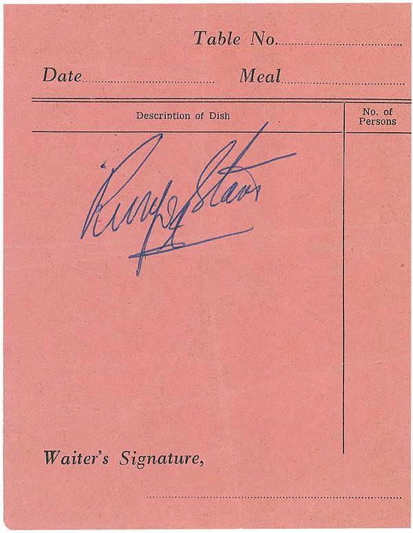 Rare Original “Liverpool Echo Pop Special Salute to the Beatles” newspaper, 11.5 x 14.5 unfolded, 16 pages. Signed and inscribed on the front cover in blue and black ballpoint, “Love to Ann, Paul McCartney,” “George Harrison to Annie,” and “John Lennon.” Also included is a vintage ballpoint signature, “Ringo Starr,” on a salmon-colored 3.5 x 4.5 dining check. Moderate central horizontal fold, scattered toning and foxing, edge wear and chipping, and several tears to spine, otherwise very good condition. Ringo’s signature rates fine, with intersecting folds. The newspaper includes an insert “The Beatles in America” which features photographs of The Beatles in Central Park, in Washington, D.C., and on Miami Beach, as well as photos showing the band on The Ed Sullivan Show and arriving at London Airport on 22 February 1964. Few of these publications have survived the years, let alone one signed by three of the band members.