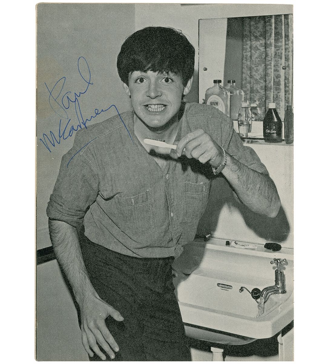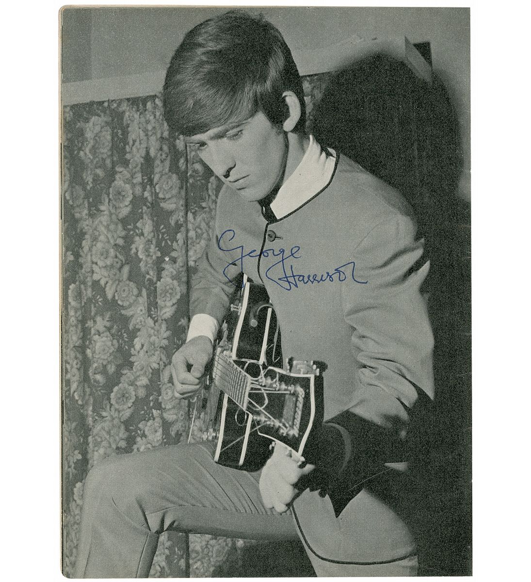 Original Beatles Book Monthly #2 fanzine, dated September 1963, 6 x 8.25, featuring articles and photos of the band. Signed inside in blue ballpoint on their individual full-page photos by John Lennon, Paul McCartney, George Harrison, and Ringo Starr. In fine condition, with scattered light creasing, soiling, and wear to covers. Accompanied by two letters of authenticity from noted Beatles expert Frank Caiazzo, one which reads, in part: “The signatures were obtained on September 8, 1963, following a performance by The Beatles at the ABC Cinema in Blackpool, England. These represent excellent examples of their signatures from that time period.” An exceptionally early set of signatures, with a glowing review from Caiazzo, presenting individually signed images within one item.
