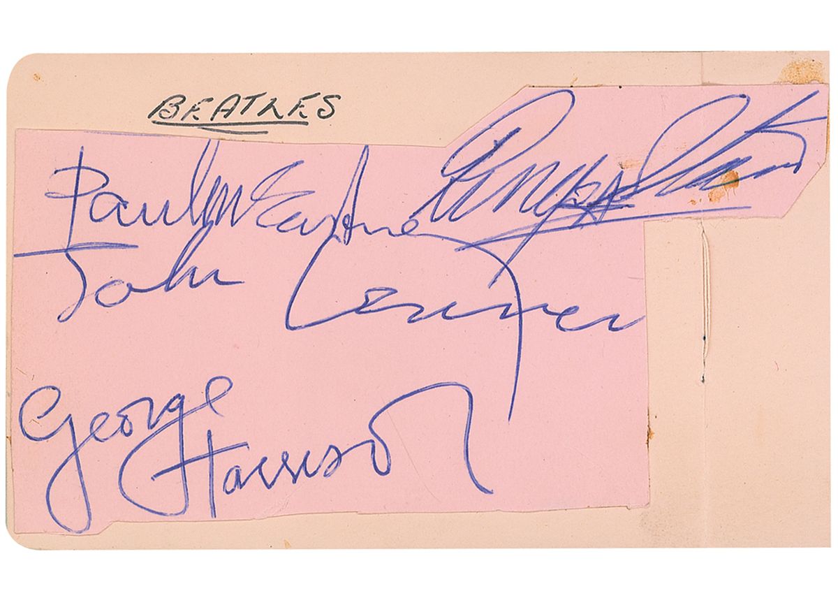 Vintage ballpoint signatures “John Lennon,” “Paul McCartney,” “George Harrison,” and “Ringo Starr,” on an irregularly clipped light pink album page. Page is affixed to a slightly larger off-white album page still contained in its original 4.25 x 3.25 hardcover autograph album. In fine condition, with closely trimmed edges, a vertical fold passing through a single letter of Ringo’s signature (where signature page extends onto second album page), as well as a bit of adhesive residue to Starr’s last name.