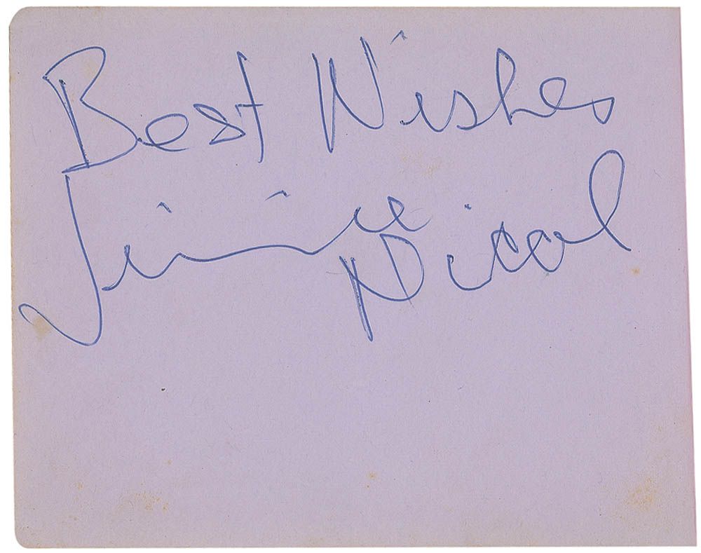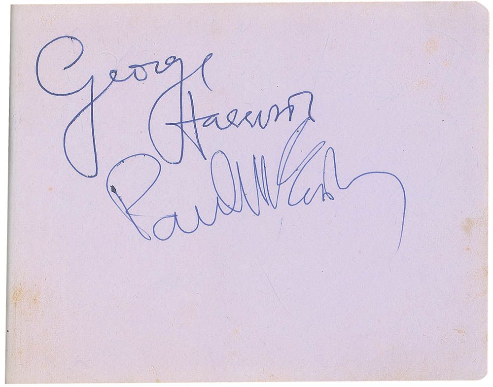 Vintage ballpoint signatures, “John Lennon,” on a light green 4.75 x 4 album page, and vintage ballpoint signatures, “George Harrison,” and “Paul McCartney,” on one side of a same-size light purple album page, with a ballpoint signature, “Best wishes, Jimmy Nicol,” on the reverse. Both pages are still housed in their original 5.25 x 4 hardcover autograph album, which is also signed by the 1964 Everton Football Club. In fine condition, with a bit of scattered light toning and surface impressions to signed pages. A unique combination, as Nicol’s tenure with the band was brief, and it was the first time the English premiers played in Australia. Nicol replaced Ringo Starr from June 3–15, 1964, at the start of the Beatles’ World Tour, while Ringo was suffering from tonsillitis and pharyngitis. An extremely rare offering, as Nicol was with the Beatles for slightly more than a week.