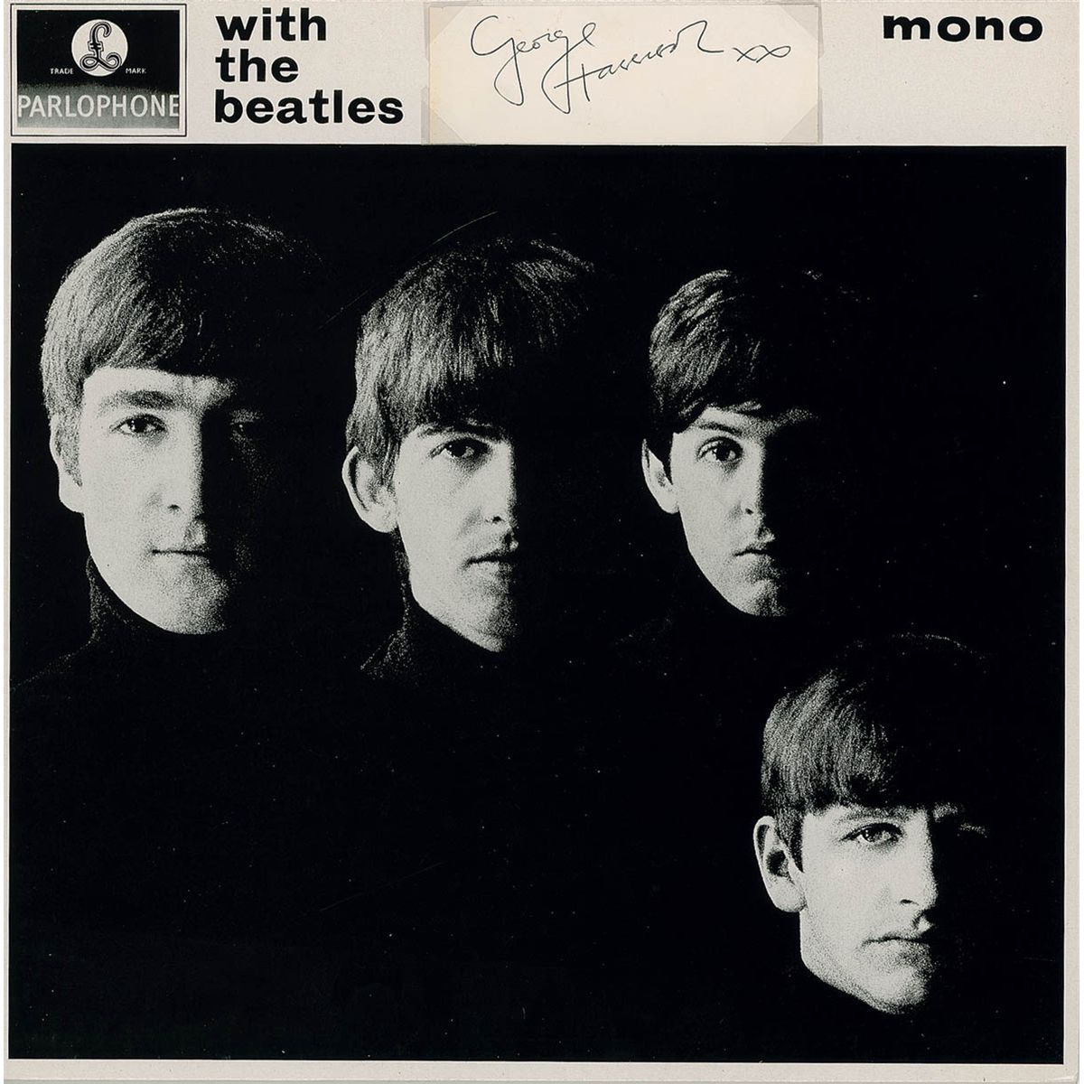 With The Beatles album, signed on the back cover in blue ballpoint, “love Paul McCartney xxx,” “John Lennon,” and “Ringo Starr.” Signatures were obtained at the Scala Theatre, London, in either March or April 1964 when The Beatles were recording scenes for a Hard Day’s Night; and a vintage late 1963 ballpoint signature, “George Harrison xx,” on a 4.5 x 1.5 off-white slip, removably attached by its corners to the front cover of a With The Beatles album. The records are included. Moderate toning and light dampstaining to back cover of signed album, and scattered moderate creases and edge wear to both sides, and light creases to Harrison’s signature, otherwise very good condition. The signatures remain very bold and legible.