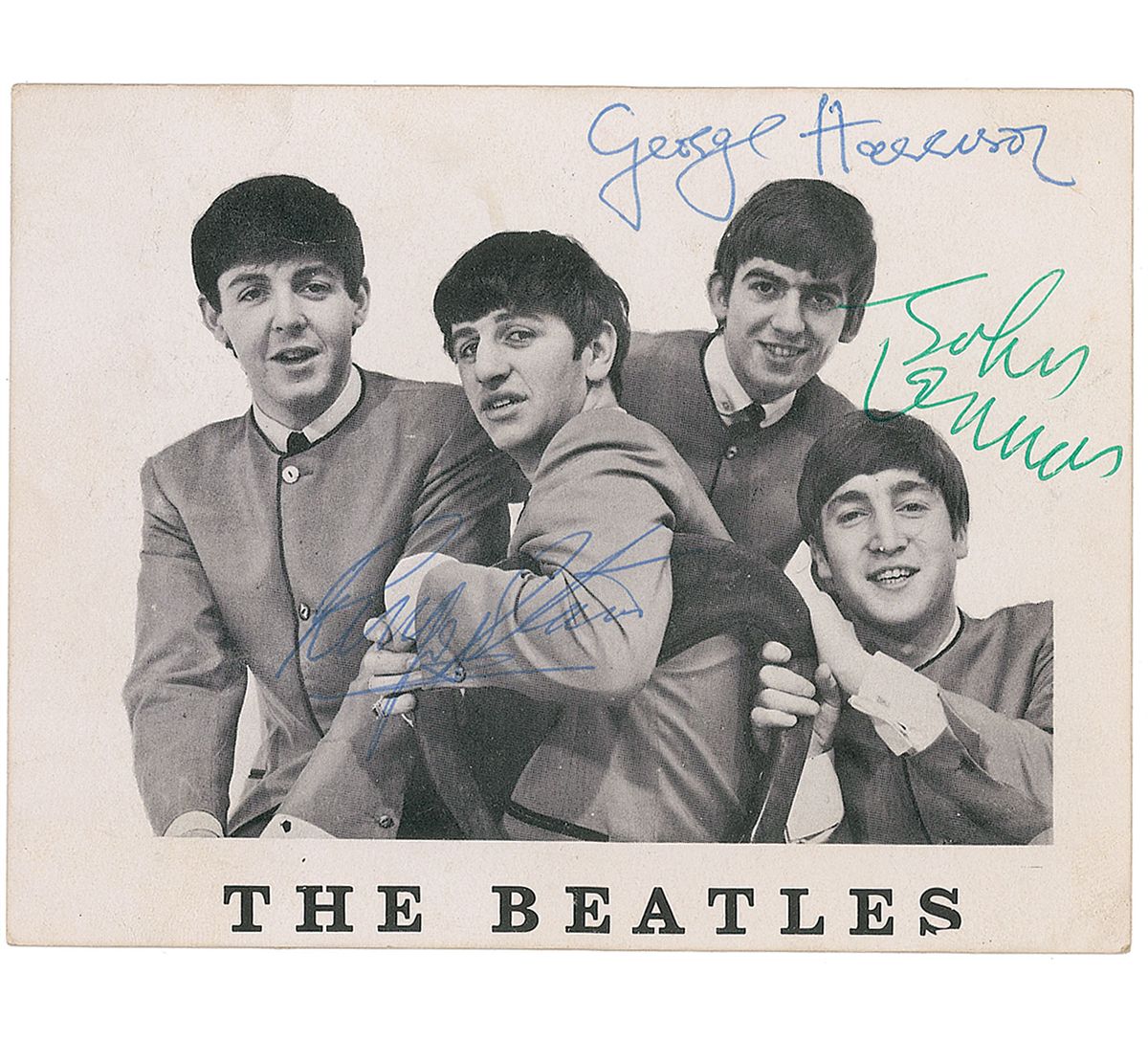 Vintage 5.5 x 4.25 official 1963 Beatles fan club photo, featuring an image by Dezo Hoffman, signed in green ballpoint, “John Lennon,” and in blue felt tip, “George Harrison,” and “Ringo Starr.” In fine condition, with a few scattered light bends and crea