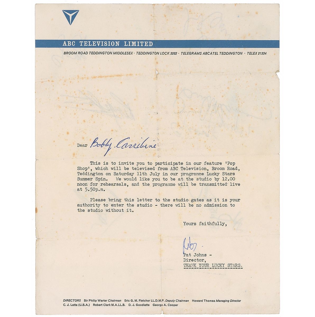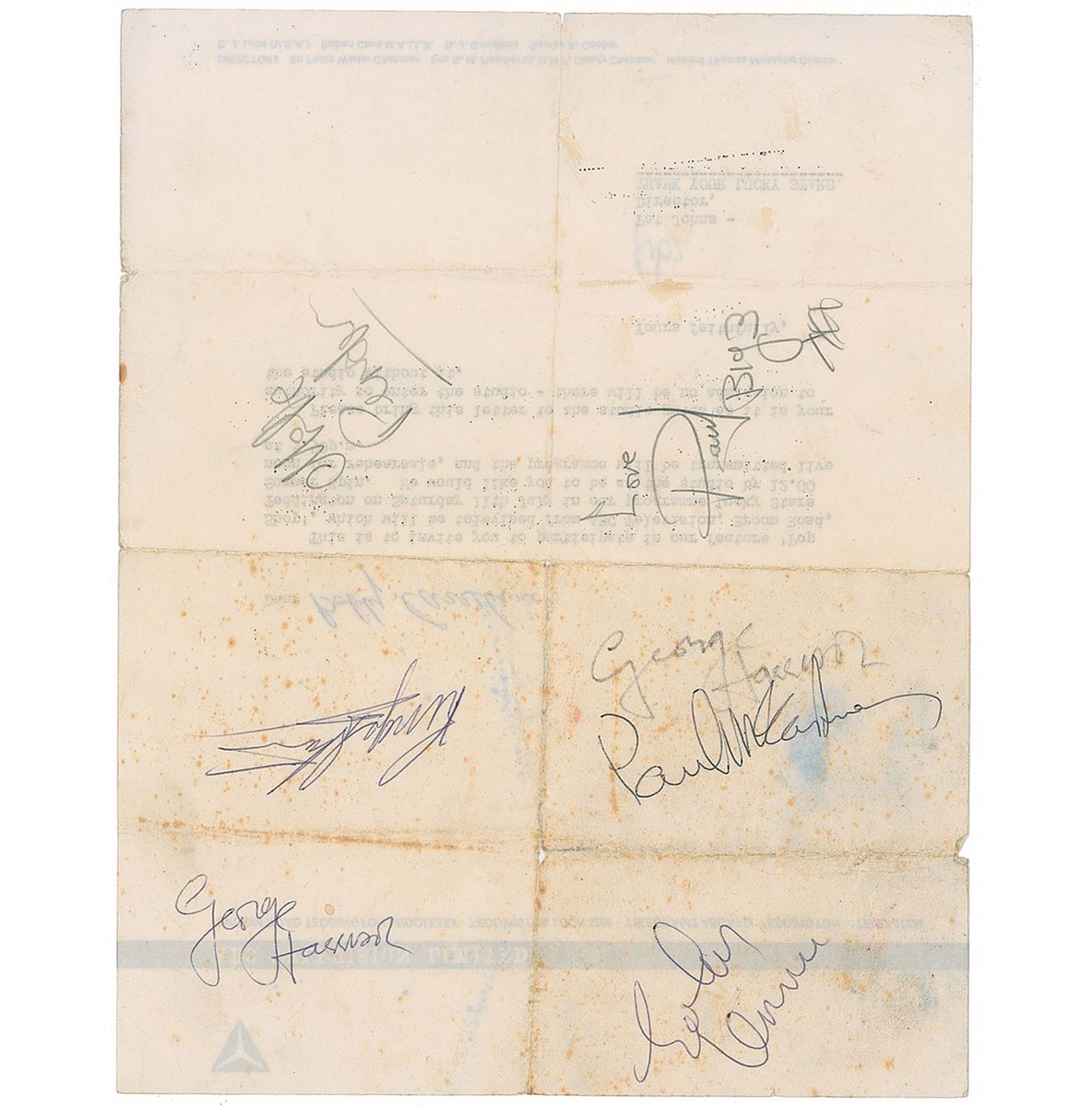An incredibly rare invitation extended to a young woman to appear on the July 11, 1964, ABC Television show Lucky Stars Summer Spin, one page, 7.75 x 10. Typed on ABC Television Limited letterhead, inviting the woman to the studio for noon, with a live broadcast scheduled at 5:50 pm. Signed on the reverse in blue ballpoint by John Lennon, George Harrison, and Ringo Starr, and in black ballpoint by Paul McCartney. Harrison has added a second signature in black felt tip. Reverse is also signed in pencil by Mike Pender and Paul of the Big 3. Intersecting folds, none affecting any of the Beatles’s signatures, scattered foxing over three of the signatures, a few pin-size areas of paper loss along folds, light wrinkling and handling wear, and Harrison’s felt tip signature fairly light, but still legible, otherwise very good condition. Accompanied by a letter of provenance from the invitation’s recipient and a certificate of authenticity from Tracks.