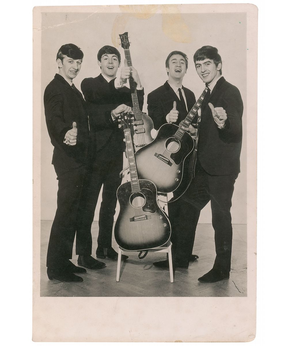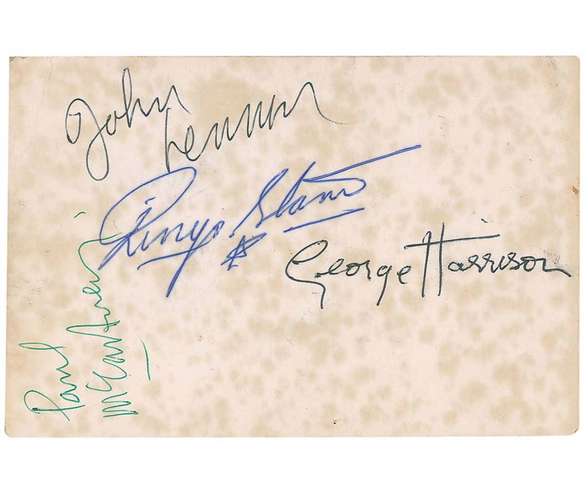 Rare and very early Beatles Fan Club promotional photo, 5.25 x 3.5, signed on the reverse in green ballpoint, “Paul McCartney,” in black ballpoint, “John Lennon,” and “George Harrison,” and in blue ballpoint, “Ringo Starr.” In very good condition, with mild overall spotting to reverse, not affecting the boldness or clarity of the signatures, a few creases to reverse; and scattered creases, soiling, surface impressions and light silvering to image side. Accompanied by a letter of authenticity from noted Beatles expert Frank Caiazzo, who states “The signatures date from late 1962, and these are excellent representative examples from this period”; as well as letters of authenticity from noted Beatles expert Perry Cox, and Tracks. Also accompanied by a 2012 letter of provenance from the original recipient who received the photo after becoming a member of the band’s fan club. In November of 1962, the band recorded ‘Please Please Me,’ and finished another stay in Hamburg. It was at this time the band’s manager, Brian Epstein, polished the band and prepared them for super-stardom. A particularly early and well-preserved example with outstanding provenance and support.