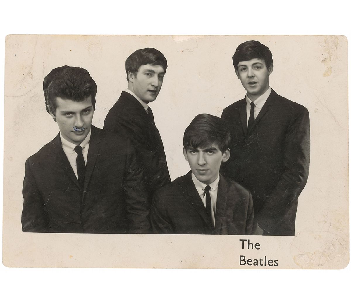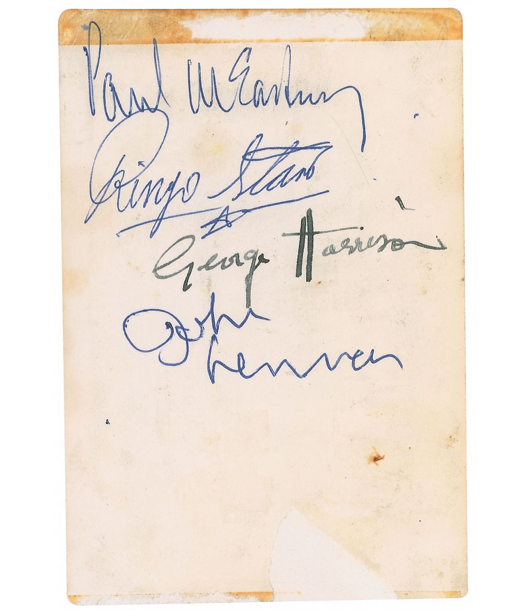 Very early vintage 5.25 x 3.5 promotional card photo of the Beatles with Pete Best, signed on the reverse in blue ballpoint, “Paul McCartney,” “Ringo Starr,” and “John Lennon,” and signed in black fountain pen “George Harrison.” Starr has also doodled a small moustache on Best on the image side. In very good condition, with scattered toning and soiling to signature side, light surface loss along bottom, and old tape toning and surface loss along top edge, slightly affecting beginning of McCartney’s signature. Accompanied by a certificate of authenticity from Tracks.
