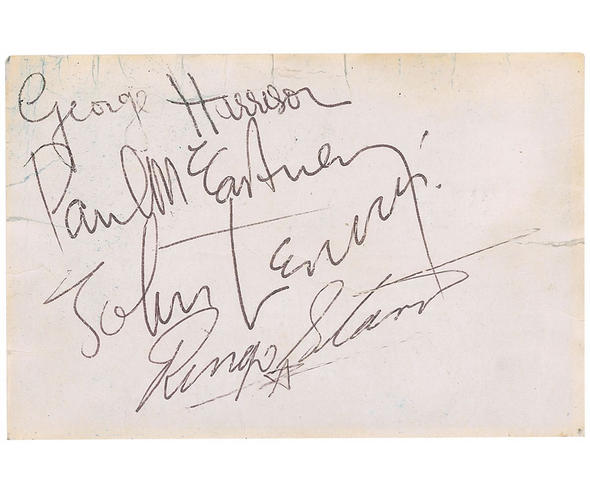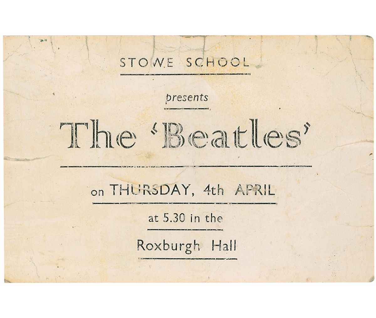 Very rare Beatles concert ticket, 3.75 x 2.5, from their April 4, 1963, concert at the Stowe School. Signed on the reverse in black ballpoint by George Harrison, Paul McCartney, John Lennon, and Ringo Starr. In very good condition, with scattered creases passing through signatures, light edge wear, mild toning, and a small tear to right edge. Accompanied by a certificate of authenticity from Tracks. The late afternoon live engagement at the all boys school in Stowe was probably one of the groups most unusual yet. The concert was booked as a direct result of a young Liverpudlian boy named David Moores writing to Brian Epstein in January 1963 asking for the group to come to the school. Epstein agreed and on April 4, The Beatles played at the school for a fee of £100. They had travelled from London’s BBC studios for the 5:30 pm concert which took place in the Roxburgh Hall in front of a polite and quite audience of boys. Famed Beatles photographer Dezo Hoffman took a number of photographs on the day which show the group mingling with the students and also performing.