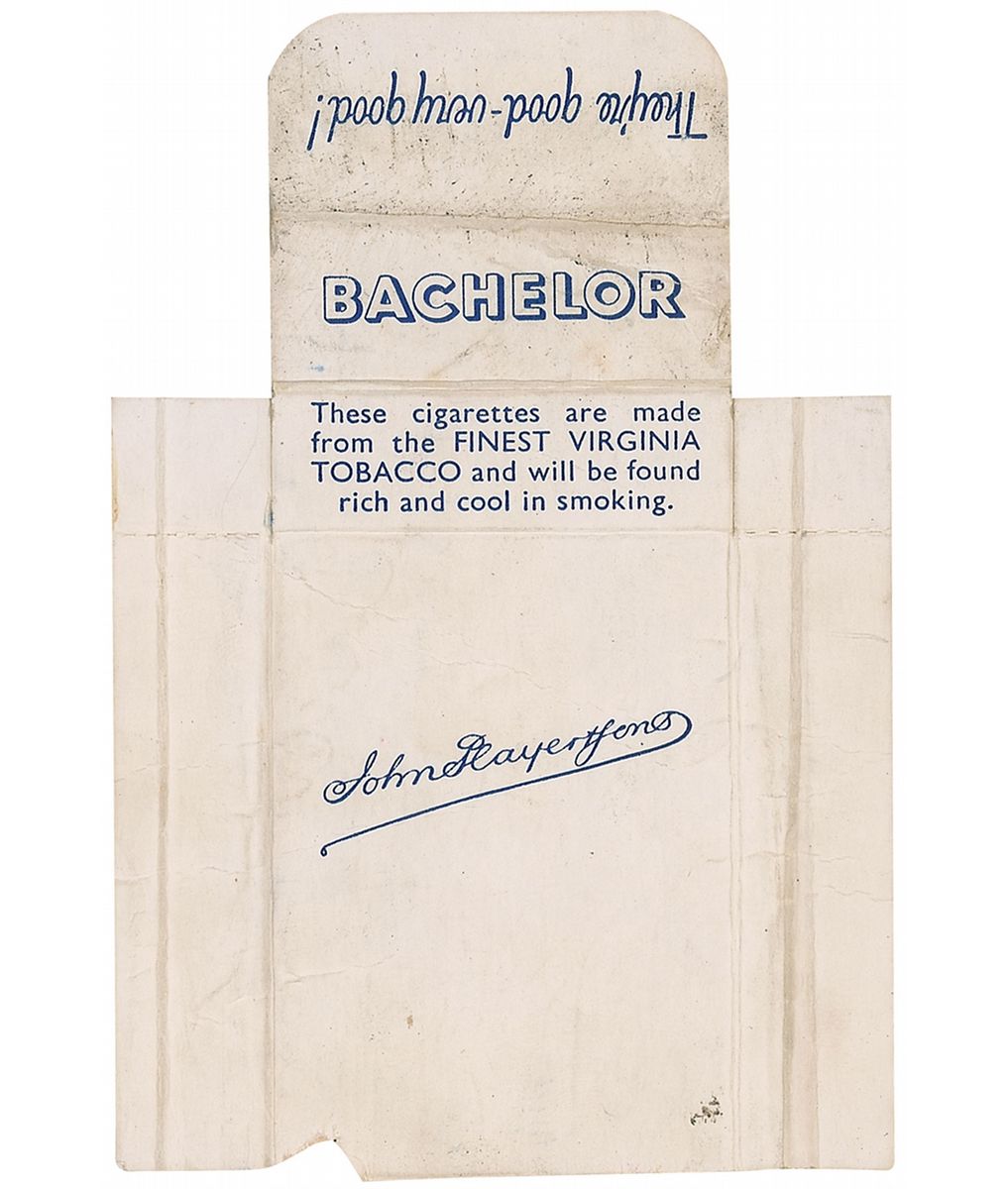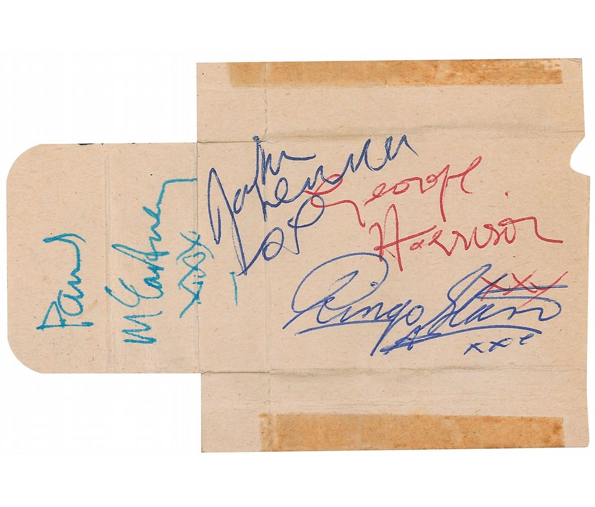 Portion of a John Players Special cigarette packet, approximately 4.5 x 3, signed on the inside in ballpoint and fountain pen, “Paul McCartney xxx,” “John Lennon xx,” “Ringo Starr xxx,” and “George Harrison xxx.” Signatures were acquired on January 28, 1963, at the Majestic Ballroom, Newcastle-upon-Tyne, England. In very good to fine condition, with manufacturer’s folds, a few creases through portions of McCartney’s signature, a mild shade of overall toning, and old tape toning to top and bottom edge. Accompanied by a certificate of authenticity from Tracks.