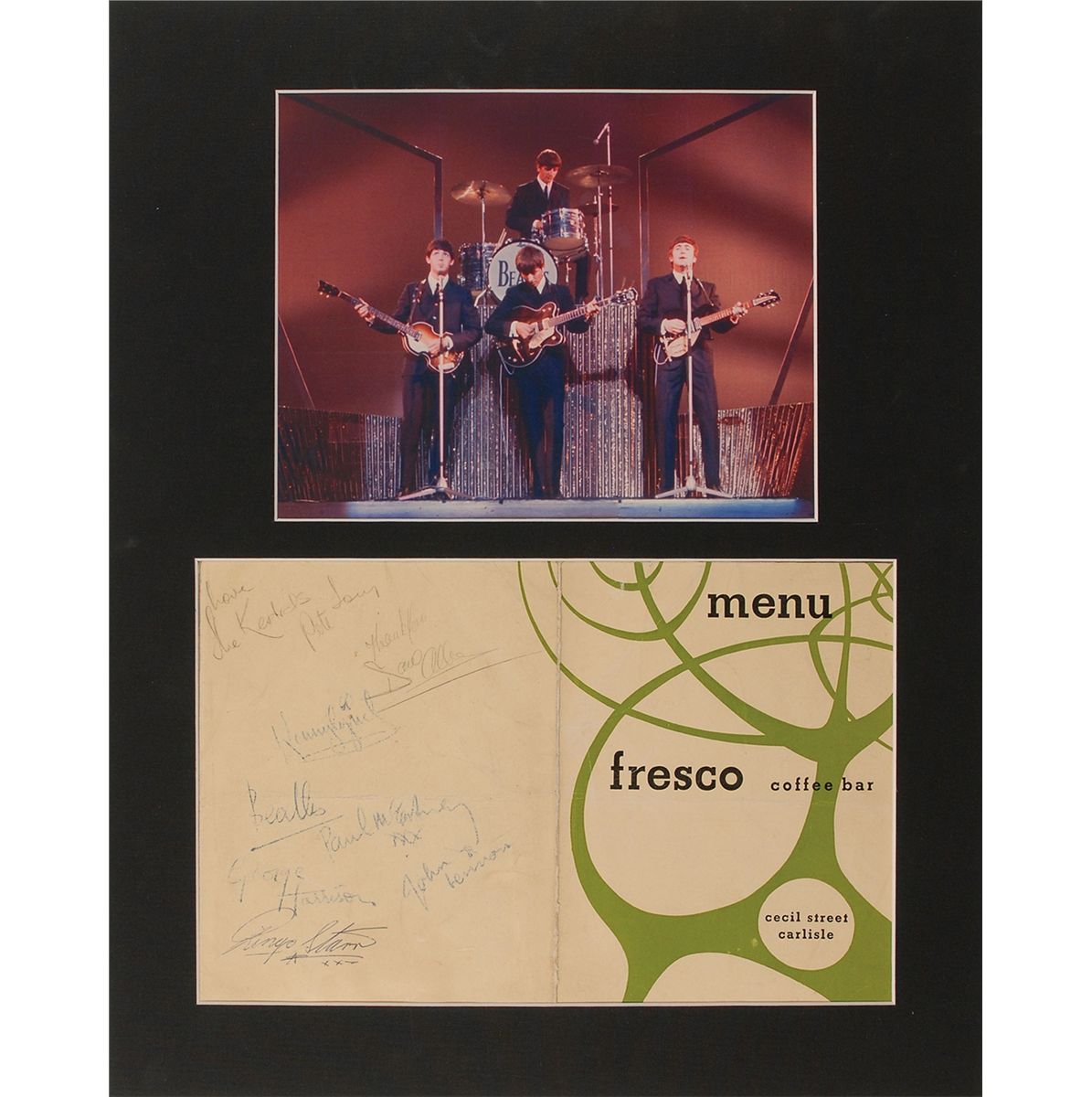 Original menu from the Fresco Coffee Bar on Cecil Street in Carlisle, measuring 12.5 x 8 opened, signed on the back cover in blue fountain pen, “Beatles, Paul McCartney xxx,” “George Harrison,” and “John Lennon,” and signed in blue ballpoint, “Ringo Starr xxx.” Program is also signed in ink and pencil by a member of the Kestrels; Irish comedian Dave Allen, and Kenny Lynch, the first artist to record a cover version of a Beatles song (’Misery’) and also one of the celebrities on the album cover of the Wings album Band on the Run. Menu is professionally matted with a color photo of the band, using all acid-free materials, to an overall size of 16 x 20.25, and can be easily removed if desired. In good to very good condition, with irregular adhesion to Lennon’s, McCartney’s, and Harrison’s signatures, resulting in a light and fuzzy appearance, a central horizontal fold, scattered creases and wrinkles, and some light toning and soiling. Accompanied by a letter of authenticity from noted Beatles expert Frank Caiazzo.