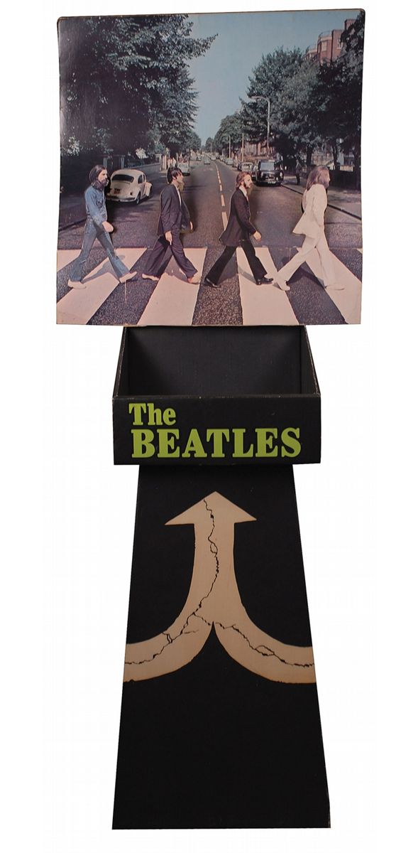 Original color three-part 1969 Beatles Abbey Road in-store promotional floor display, standing almost five feet high. In very good condition, with horizontal creasing to each figure, some other small creases to background, and expected light overall age wear. The most impressive and imposing of the various Abbey Road promotional items is this cardboard record store floor display that held up to two dozen copies of the Apple Records album. The oversized 22 x 22 die-cut album is affixed to a cardboard pole from behind that fits into the back of the record bin. Exceedingly rare, no more than a half-dozen of these displays are known to have survived the 42 years since its original release on October 1, 1969. The Beatles final studio masterpiece was ranked #14 on the Rolling Stone Magazine list of the ‘500 Greatest Albums of All-Time’ and, in 2009, was voted by readers as The Beatles’ finest album. Due to the fragility of this promotional display, as is the case with other similar, over-sized and multi-part displays of the era, they were usually discarded by record outlets because of their size. The few that survived were usually the result of being rescued by fans. Finding them today, especially in good condition is quite uncommon.