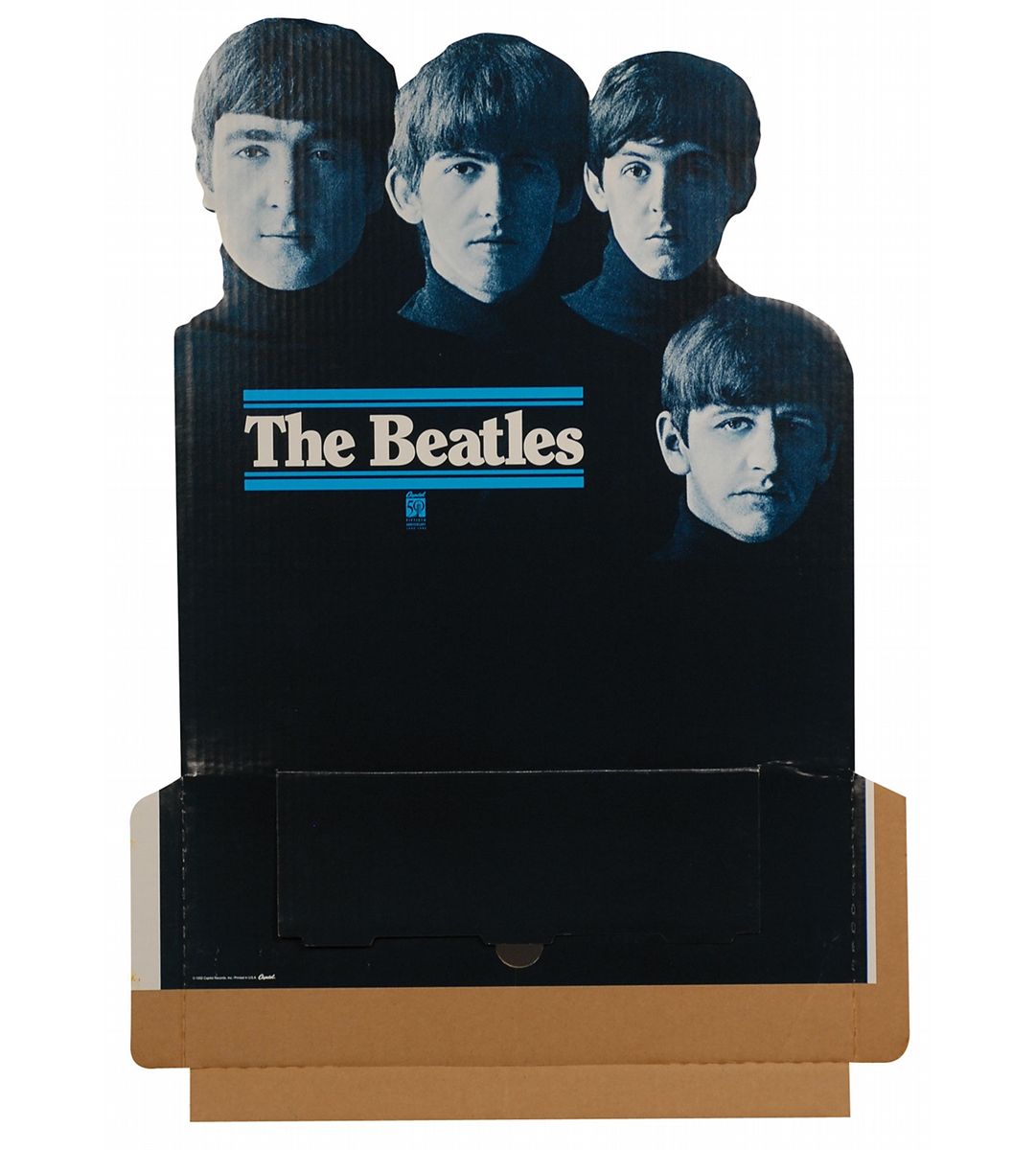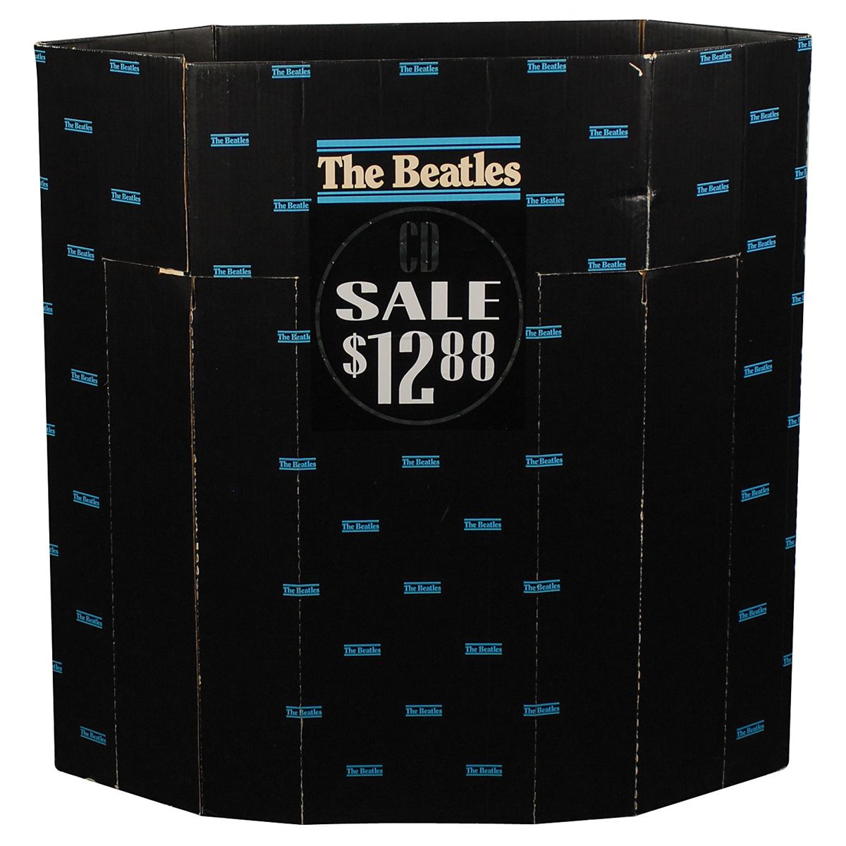 Unassembled Beatles CD record store display from 1992. The two-piece display features a 30? high base with a 25? upper section which features a die-cut image of the band from their Meet the Beatles album cover. In fine condition.