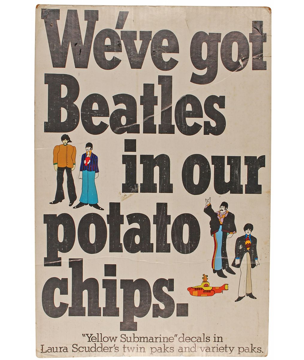 Original color Beatles Laura Scudder Potato Chip promotional poster, 20 x 30, featuring animated images of the band from Yellow Submarine, with the text reading “We've got Beatles in our potato chips, Yellow Submarine decals in Laura Scudder's twin paks and variety paks.” Poster is affixed to an identical size piece of corrugated cardboard. Scattered creasing, toning, and soiling, and two small triangular chips to bottom edge, otherwise very good condition. Accompanied by a certificate of authenticity from Tracks.